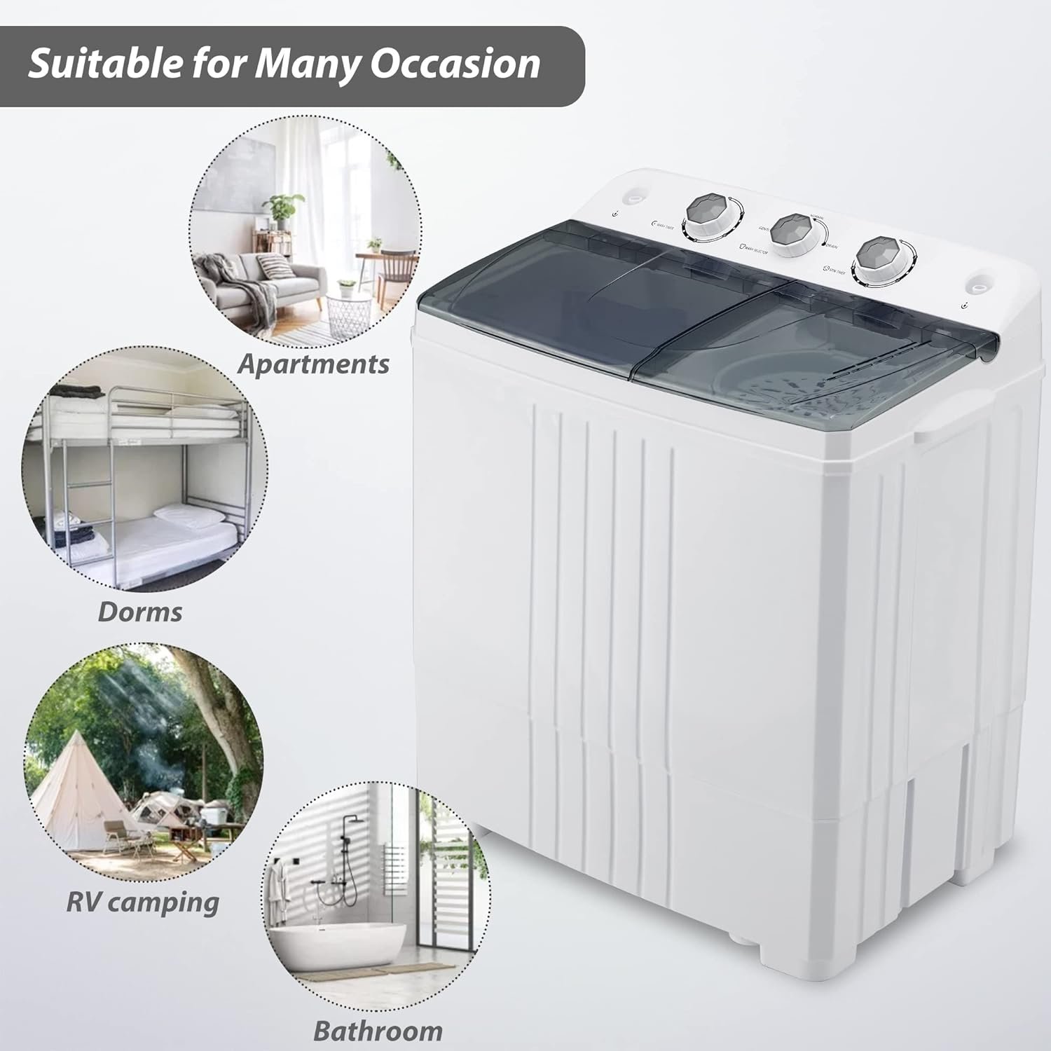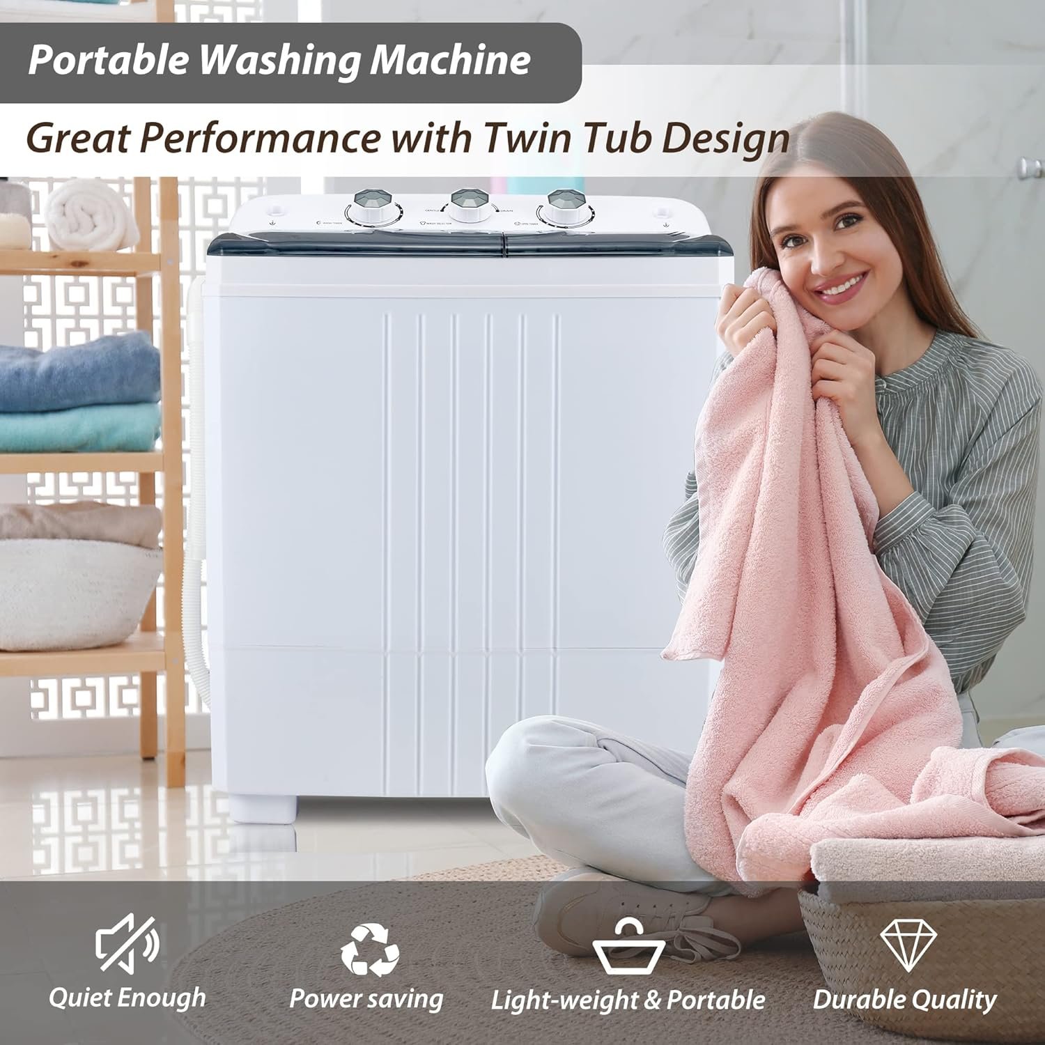 Washing tub(13.2lbs) and spining tub(8.8lbs) meets daily laundry needs Separate washing and drying functions can be controlled by different timer switches Detachable lint filter better collects lints in water Built-in drainage pump and extended drainage hose to quickly drain water