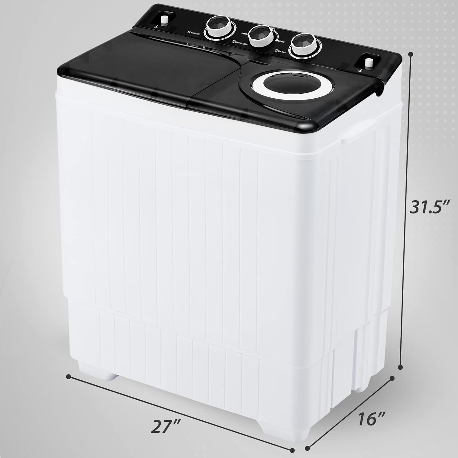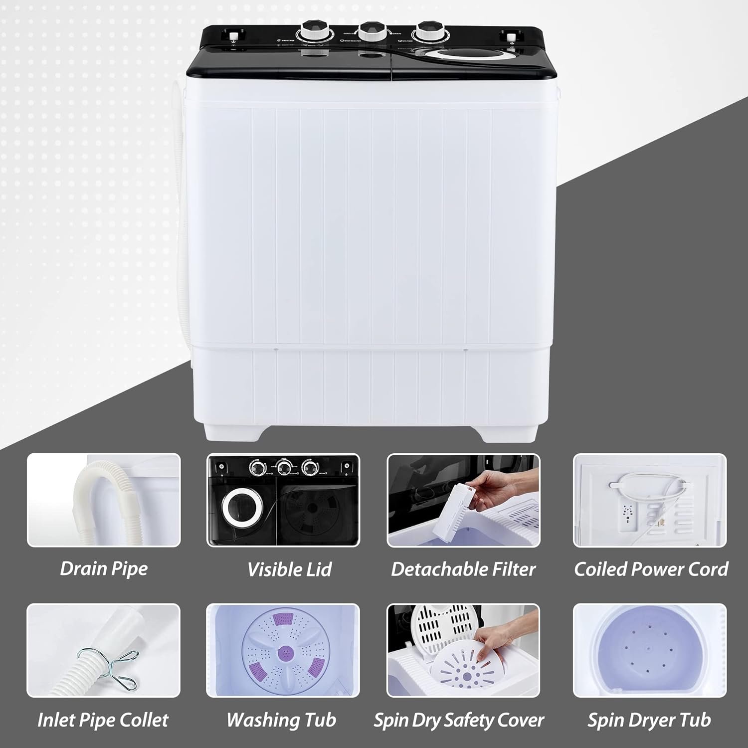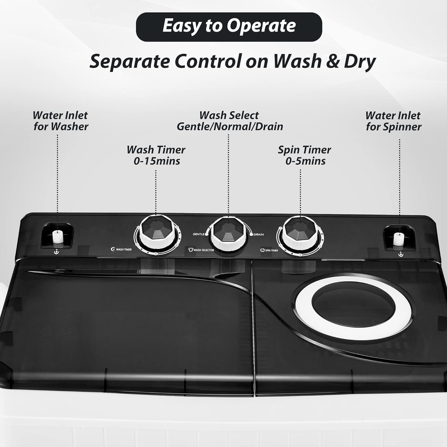 Washing tub(18lbs) and spining tub(8lbs) meets daily laundry needs Separate washing and drying functions can be controlled by different timer switches Detachable lint filter better collects lints in water Built-in drainage pump and extended drainage hose to quickly drain water