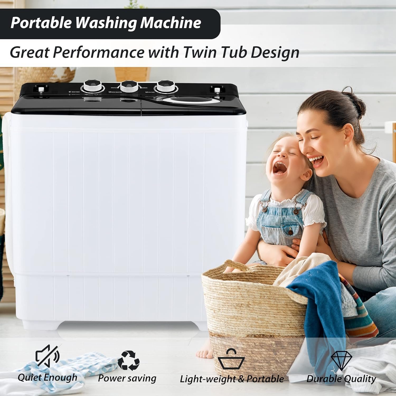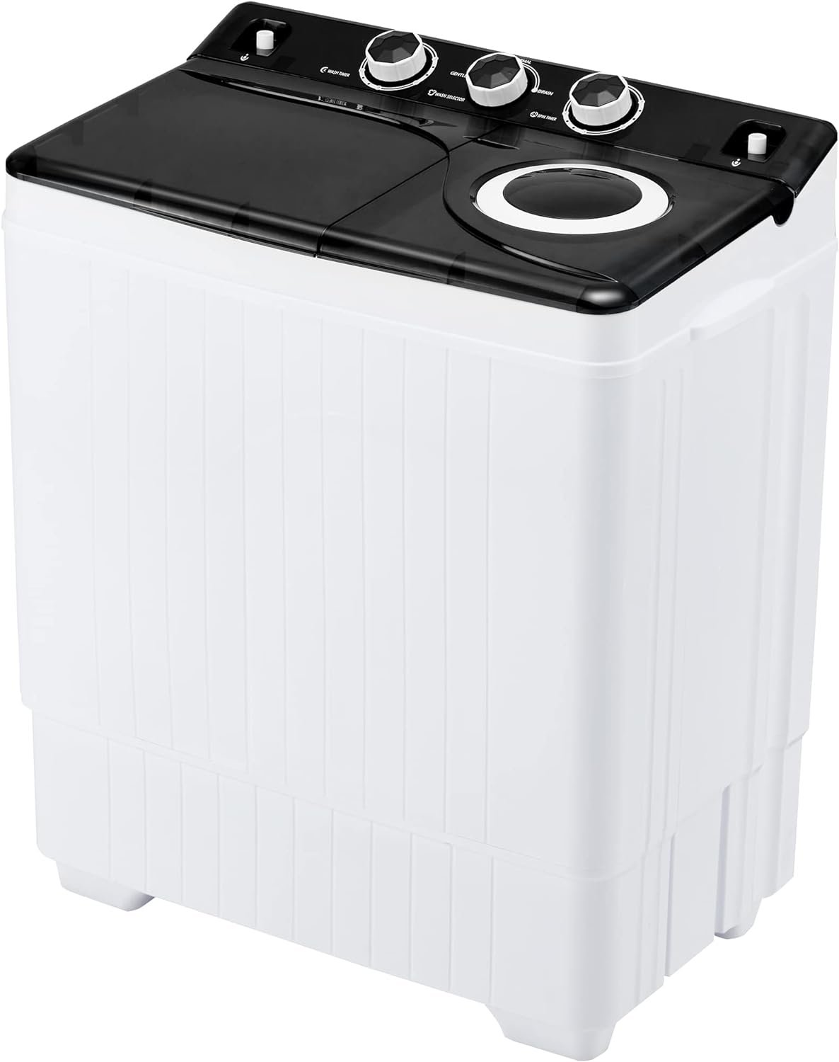 【Twin Tub And 26LBS Capacity】:The washing machine has twin tub design for both cleaning and drying,saving your valuable time. With 18 lbs wash capacity and 8 lbs spin capacity,the washer is perfect for washing daily laundry quickly.Moreover, transparent cover allows you to check the washing/spinning process at any time. Constructed of High-density plastic body+ Aluminum pump+ Upgraded motor, it is well built for years use.