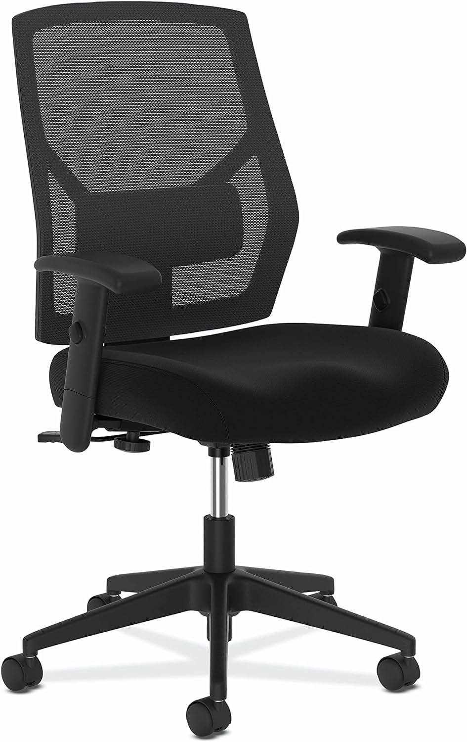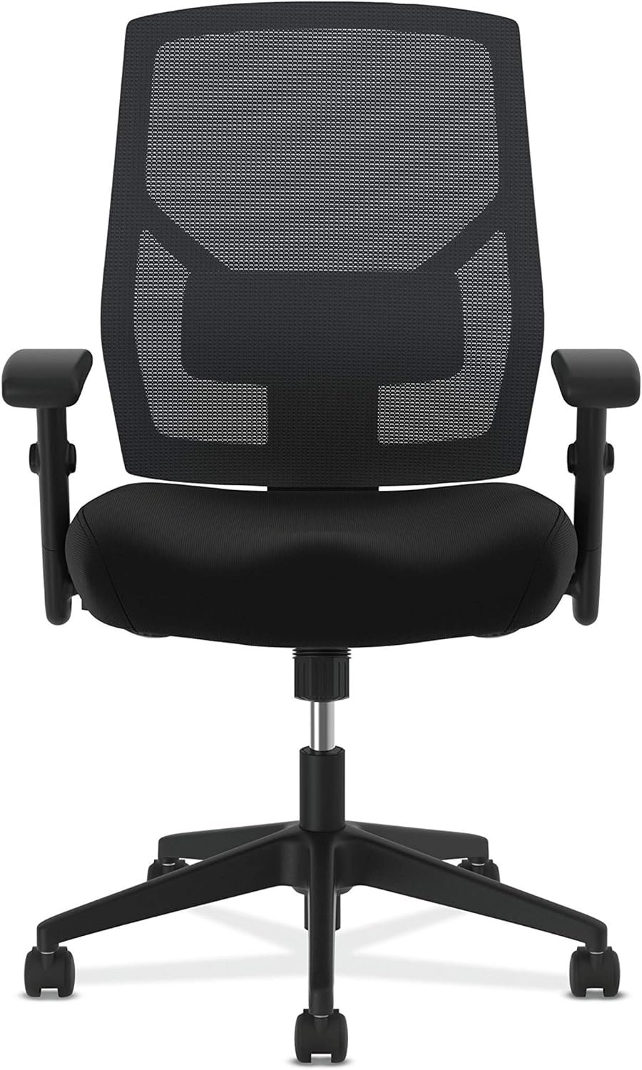 This HON Crio high-back task chair gives you advanced features at a compelling price. The breathable mesh back delivers cool comfort while giving the chair a cool look, and the adjustable lumbar support enhances lower back comfort. Height- and width-adjustable arms put the support right where you need it, while the center-tilt recline control allows you to find the most comfortable posture. Simple, clean design combined with customizable comfort make this a great value. Mesh and seat fabric colors are Black.