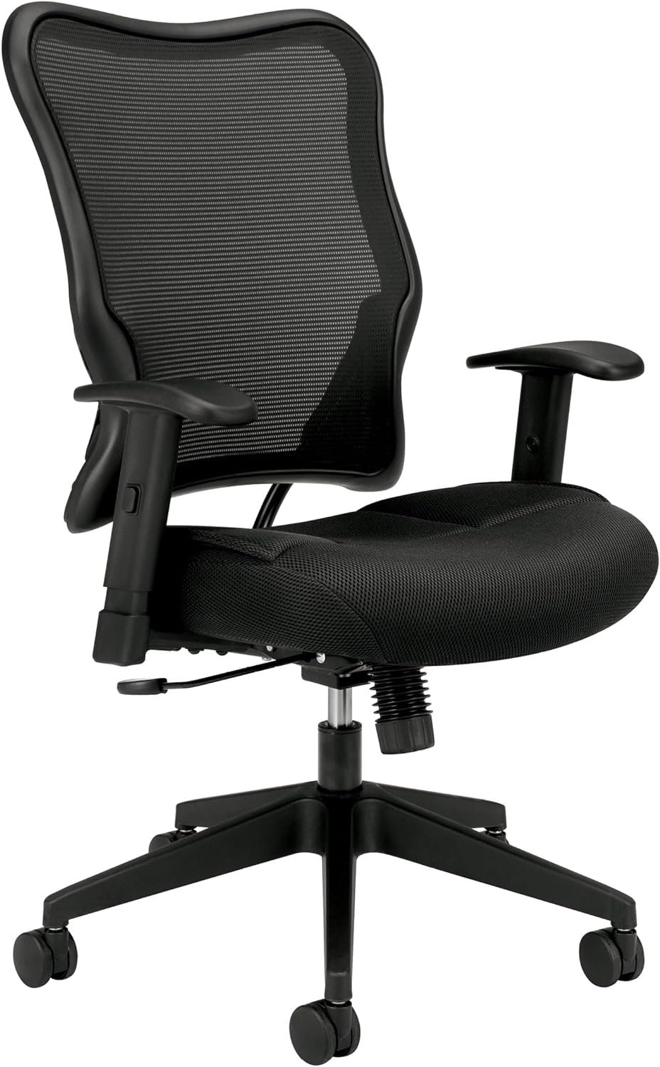 The HON Wave Mesh High-Back Task Chair, with Height-Adjustable Arms, in Black, provides a clean visual design that makes this chair a great investment. This task chair features a two-layer breathable woven mesh back that conforms to the upper body for added support. This computer chair provides exceptional comfort with the addition of sandwich mesh. The chair has adjustable-height arms that move up and down for shoulder and upper body support. Comfort controls such as synchro-tilt, upright tilt lock, tilt tension, and pneumatic seat height adjustment provide opportunities to customize this office chair to your needs. The chair features a five-star base that is molded from reinforced resin and has a 360-degree swivel that provides freedom of movement. This multi-purpose chair features a 250 lb weight capacity and is backed by the HON Limited 5-Year Warranty.
