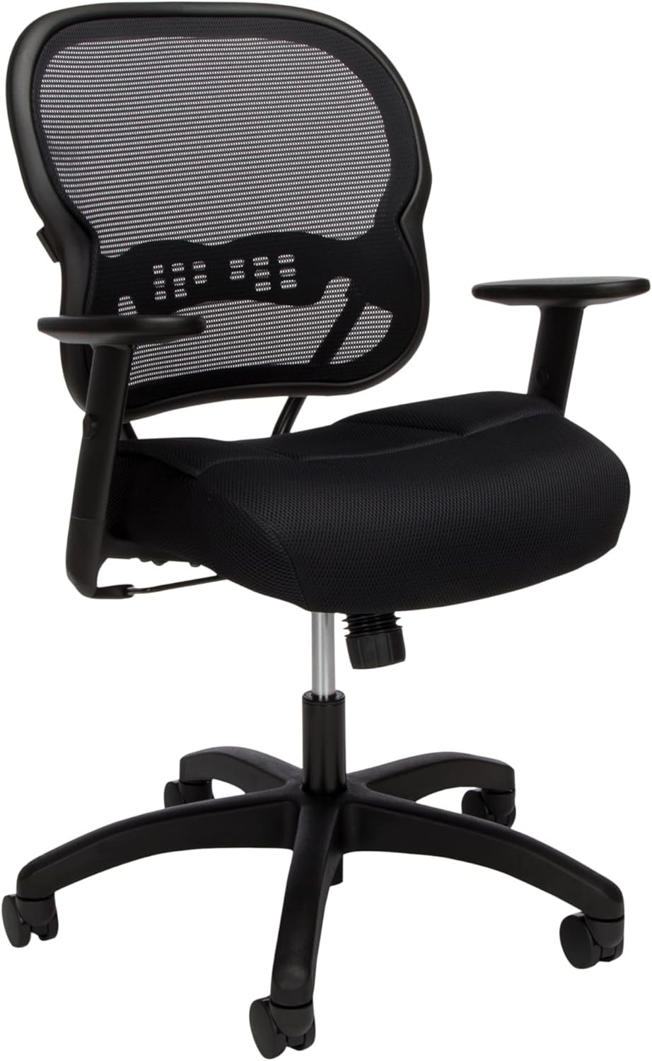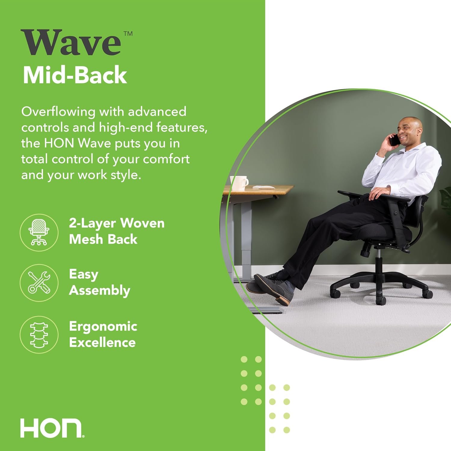 The HON Wave Mesh Mid-Back Chair, with Height-Adjustable Arms, in Black, provides ergonomic adjustments and a clean visual design that make this chair a great investment. The task chair features a breathable two-layer woven mesh back that conforms to the upper body and a sandwich mesh seat, both provide additional support and exceptional comfort. Adjustable-height arms move up and down for shoulder and upper body support. The desk chair has a synchro-tilt mechanism that reclines the back at a higher ratio than the seat for proper back alignment. The task chair has an upright tilt lock, tilt tension, and pneumatic seat height adjustment to round out the ergonomic features available to help customize the chair for your needs. The computer chair features a five-star base that is molded from reinforced resin and has a 360-degree swivel that provides freedom of movement. This multi-purpose chair features a 250 lb weight capacity and is backed by the HON Limited 5-Year Warranty.