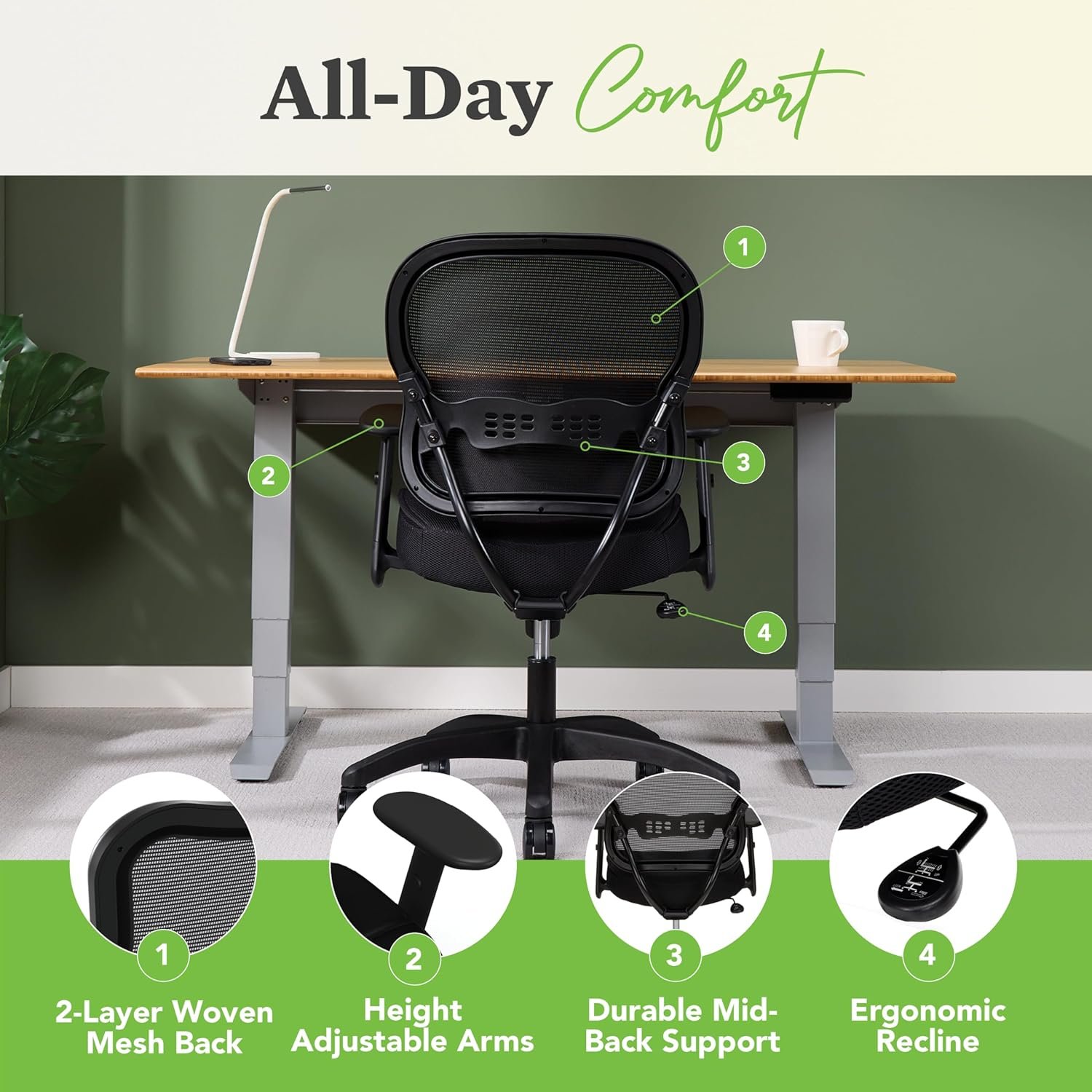 ON THE MOVE: Pull up to your computer desk, swivel around to collaborate with your teammate, or wheel over to the snack area for a quick break with this five-star resin base and durable wheels