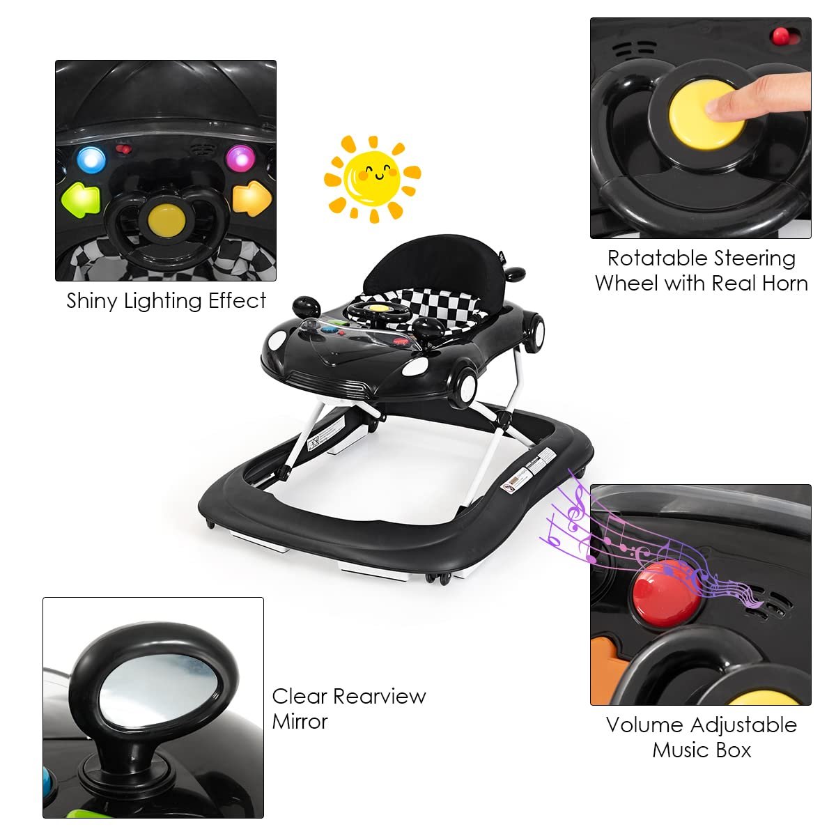 【Car Walker with Steering Wheel】: This cross bar of baby walker can be removed to provide free conversion from a seated walker into a walking baby walker. And the walker for baby boy comes with game panel for lifelike sound and flashing lights to improve the hand-eye coordination.