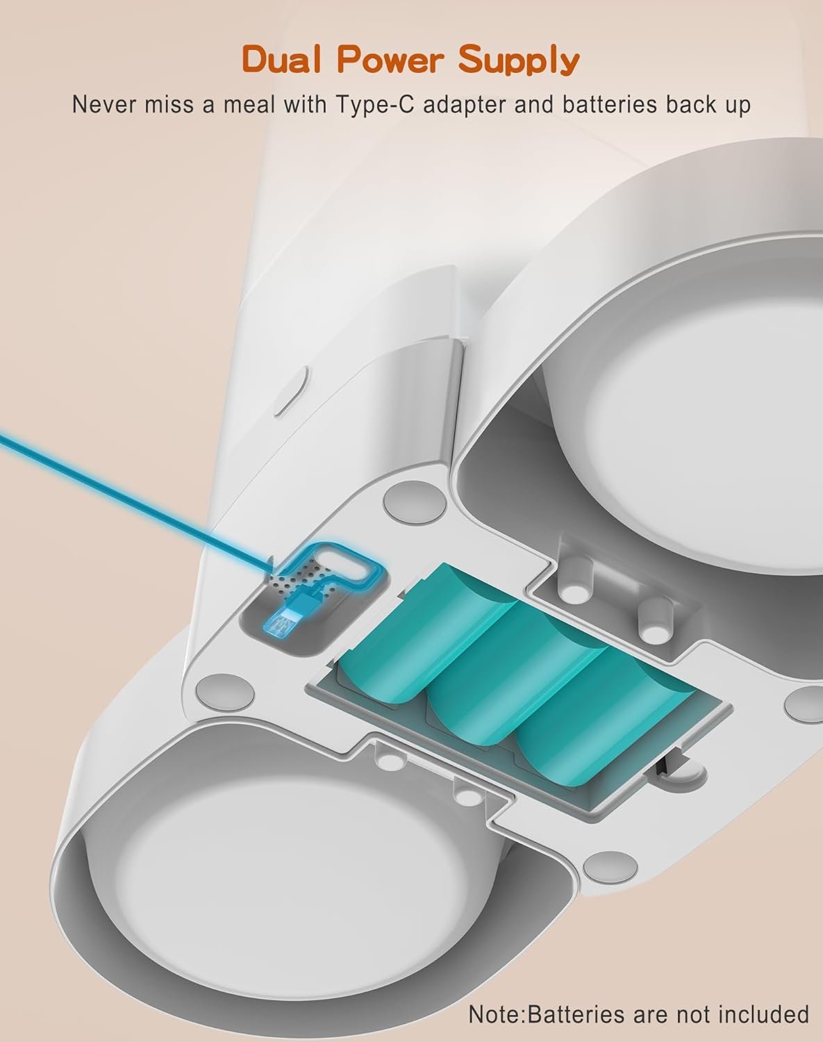 [Dual Power Supply ] The timed cats feeder can be powered by USB power adapter and 3 alkaline D-size batteries (NOT Included). Once the feeding schedule is set, it is repeated every day. In the event of a power outage, the automatic feeder will automatically switch to battery power. For safety reasons, it is recommended to use Battery power sources. Battery alone can supply power for 200 days.No need to worry about your pet going hungry while you are away.