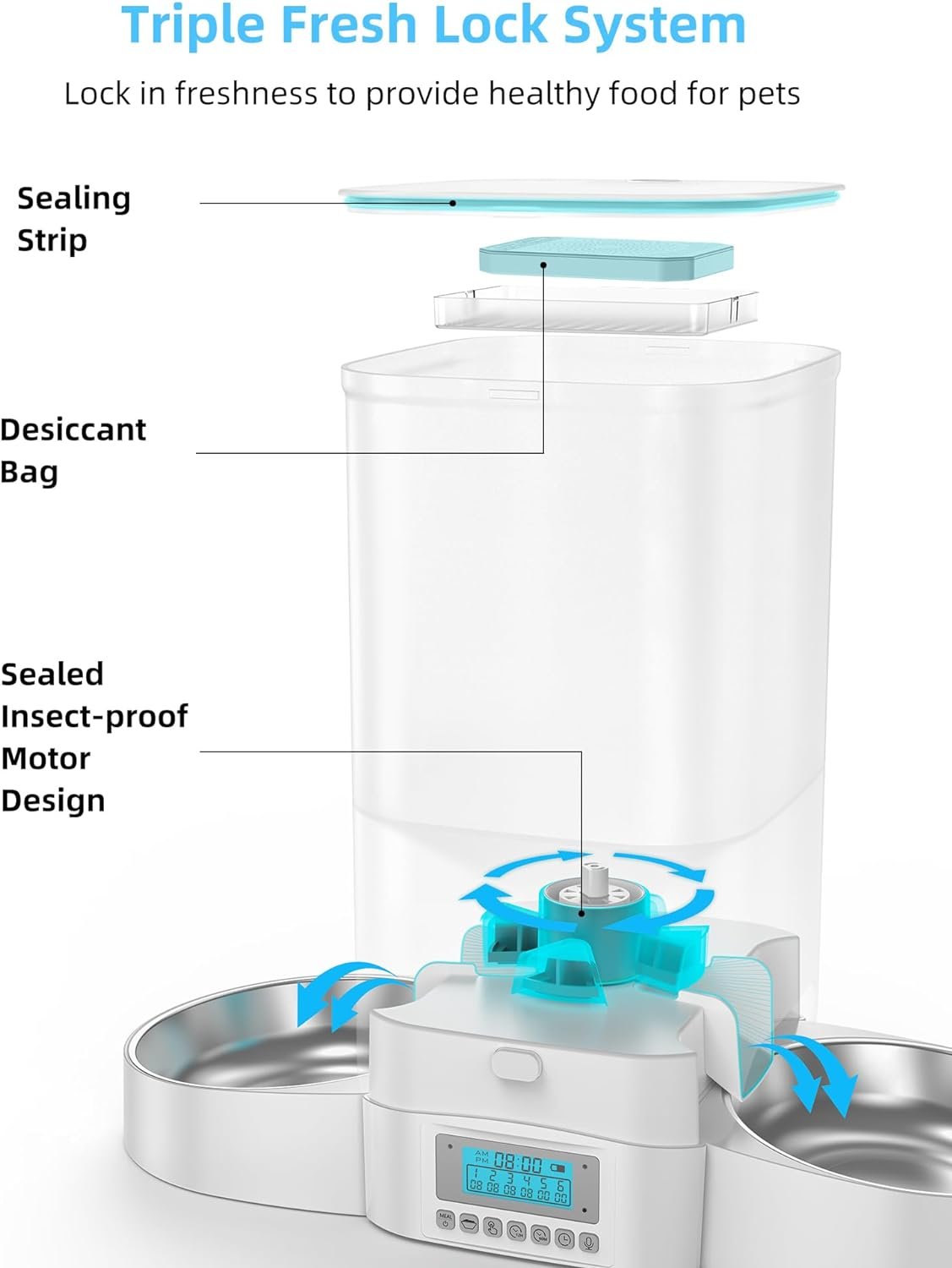 [Multiple Sealing Keeps Food Fresh] The rubber seal between the lid and the container of the automatic feeder effectively insulates the air to prevent the food from oxidizing and prevents the smell of your pet’s food from escaping. There is also a desiccant bag on the lid to dehumidify and prevent moisture. The unique sealed revolving door design in the feeder automatically closes the feeding port after each feeding is completed, preventing ants and insects from entering