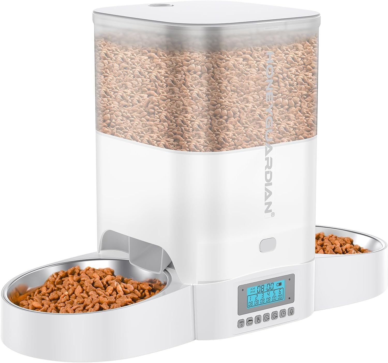 [Unique Dual Side Equal Feeding] HoneyGuaridan Dual Cat Automatic Feeder achieve equal distribution of pet food on both sides, effectively avoiding uneven feeding. The left and right feeding design provides a quiet feeding environment for your pets. You no longer have to worry about your pets competing for food.