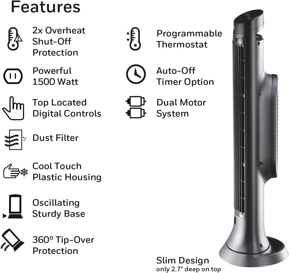 INCREASE YOUR COMFORT – Always be comfortable, no matter what season it is. This personal heater has a tower design, so it fits into any room in your home without taking up too much space. It has a sturdy base, oscillation and cool touch plastic housing.