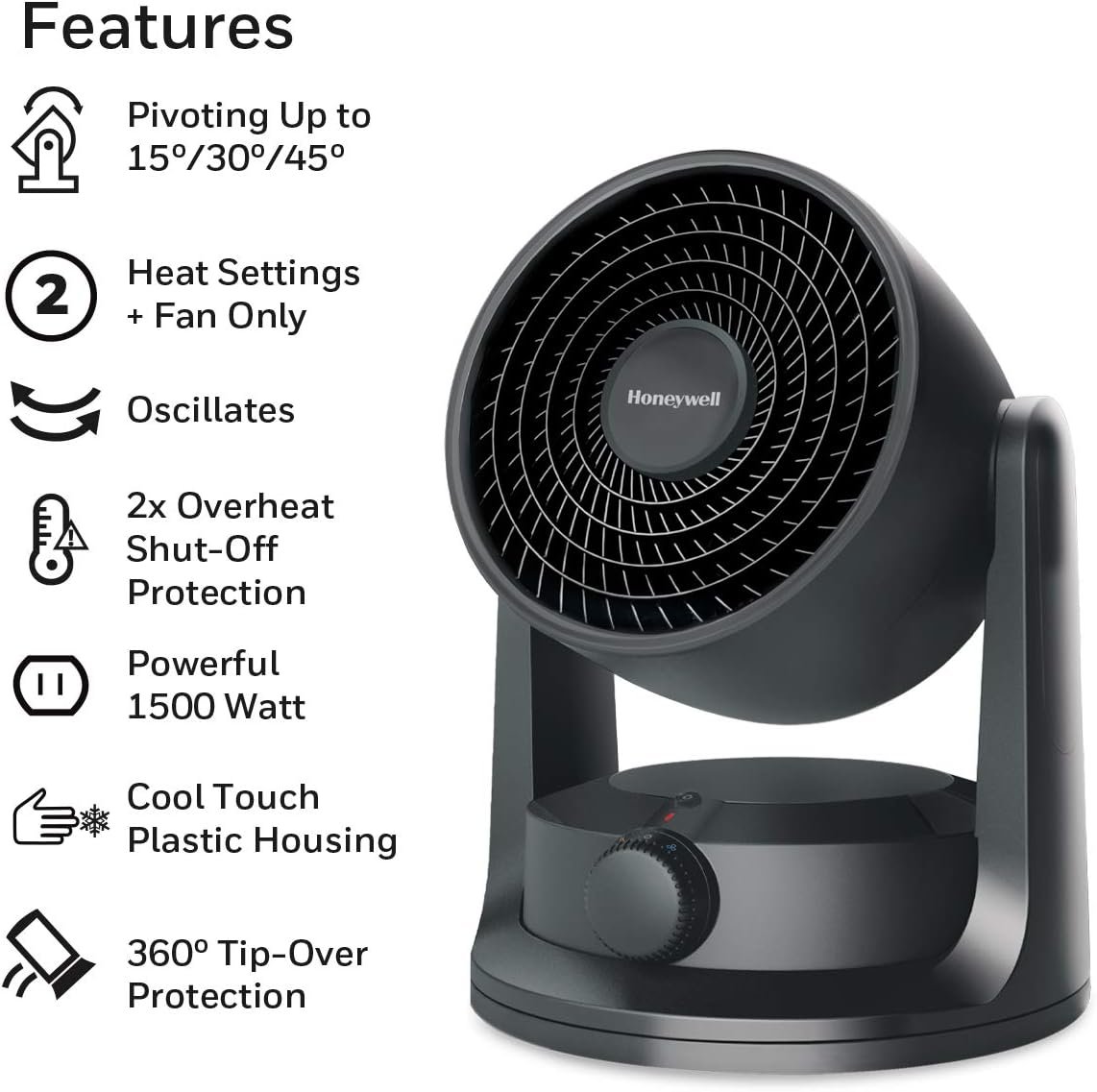 Feel the Power of our Honeywell Turbo Force Personal Heater, engineered to deliver iconic Turbo Force circulation and powerful heat, on demand! This personal heater features easy-to-use controls with 2 heat levels (high and low) and a fan-only setting designed to quickly provide warmth and heated air circulation when and how you need it. The enhanced safety features on this room heater allow for peace of mind. It features an easy-to-use dial, 2x Overheat Protection and 360° SafetyTip, which shuts the heater off if it is tipped in any direction. Pair all of that with the pivoting head, automatic timer settings (1, 2, 4 & 6 hours) and oscillation function, and you can easily personalize your comfort in any season. Plus, the easy-grab, cool-touch handle makes it easy to carry this portable air heater from room to room. With a space heater, you can save money and energy! By turning down your whole house thermostat a few degrees and heating just the room you are in, a Honeywell small heater can help you save money while providing soothing warmth.