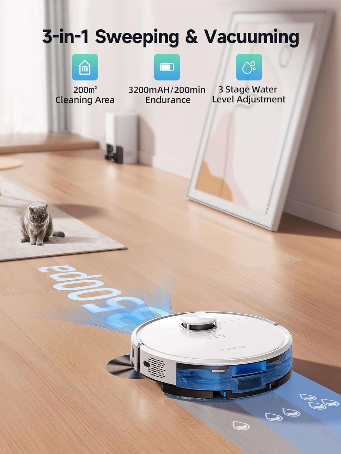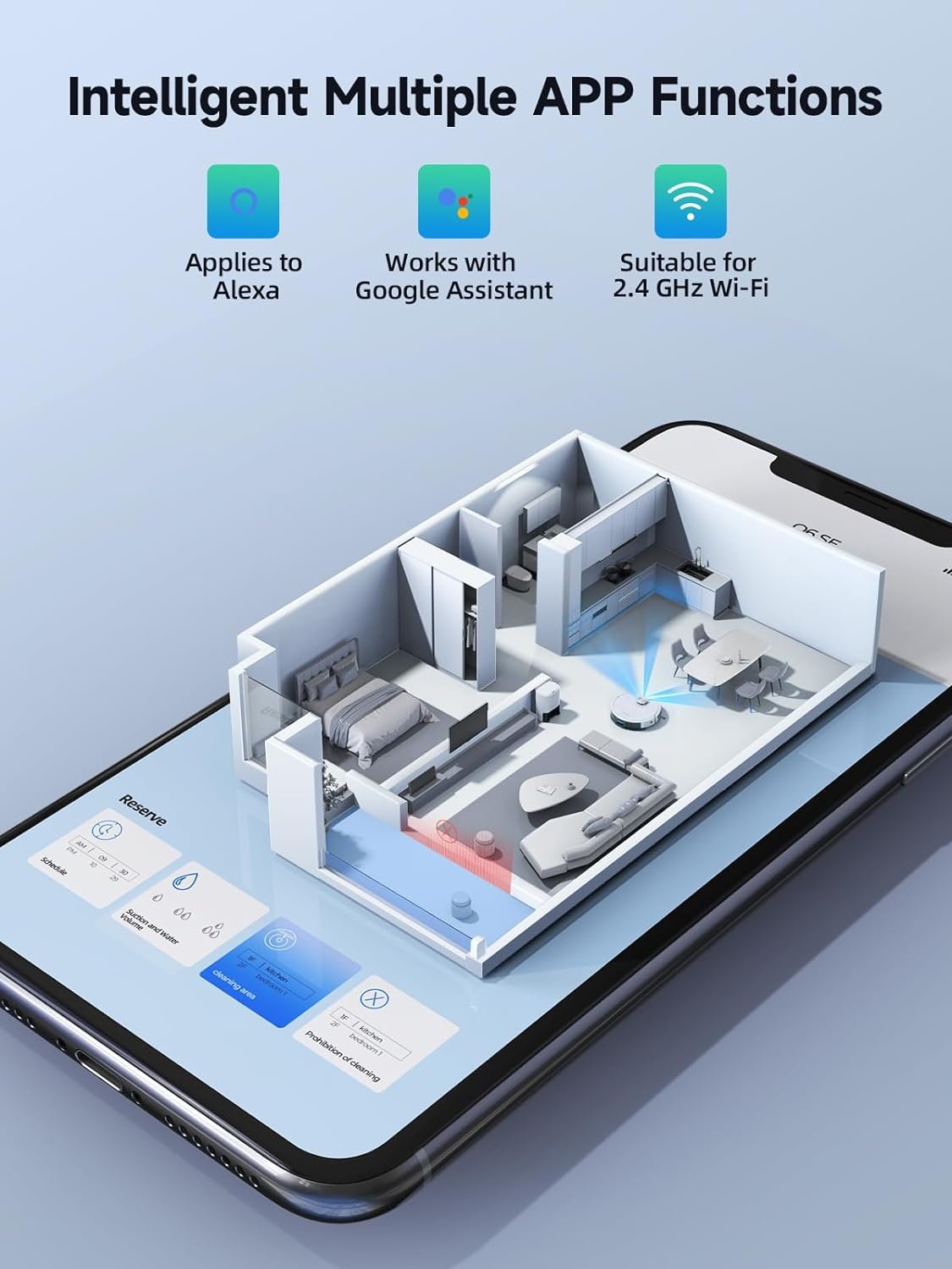 🤖Smart App and Voice Control ➤Q6 SE Robot Vacuum and Mop can be connected with Honysmart App (⚠️2.4G Wi-Fi Only), from your mobile phone you can monitor cleaning routes, set cleaning schedules, adjust suction power, water level, change cleaning modes, create no-go zones, etc.HONITURE Robot Vacuum also works with Alexa (ON/OFF).