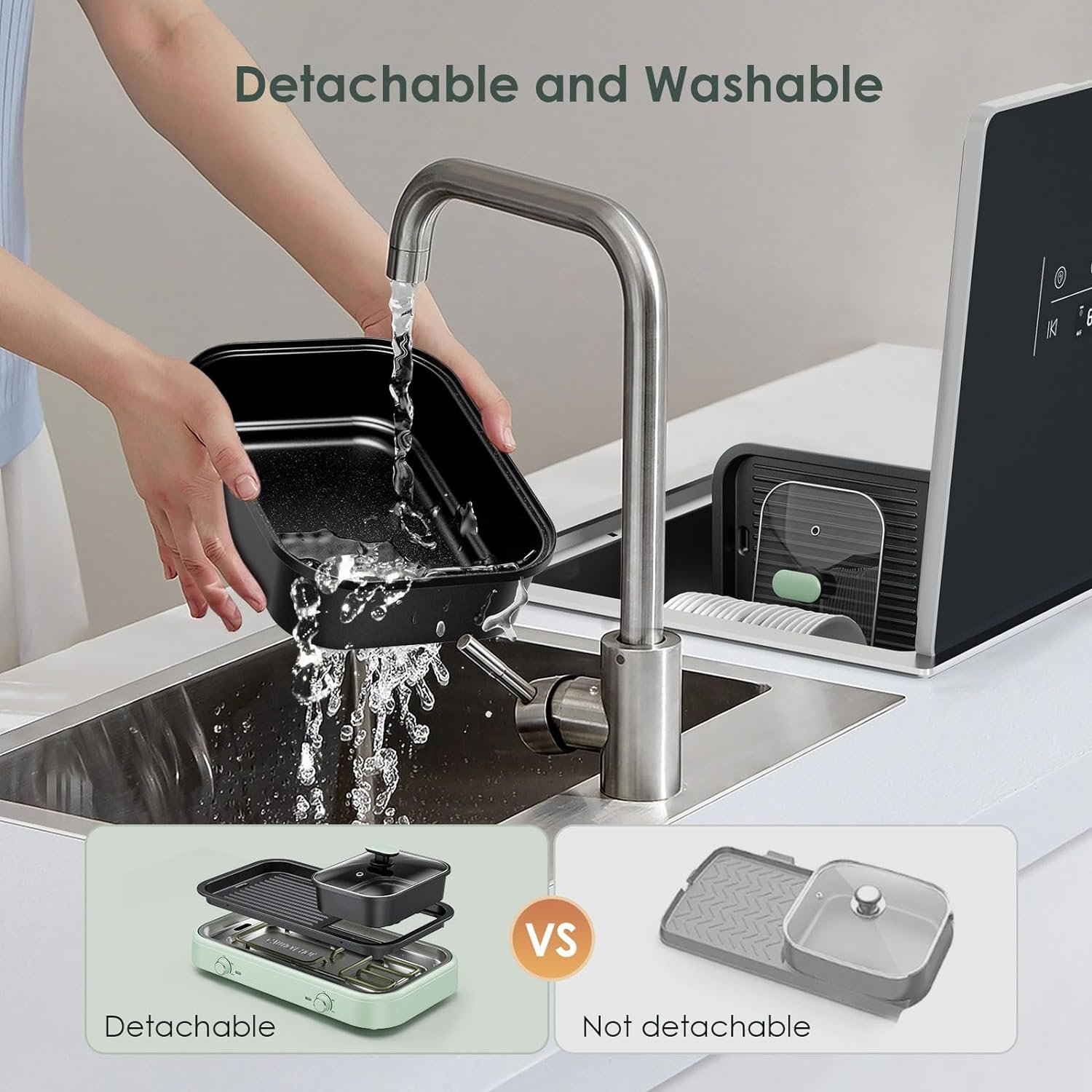 Portable Cooking Appliance: This mini grill and hot pot is great for cooking in a small space and is also great for RV camping cooking. The disassembly design allows you to clean only the baking tray and pot without having to move the entire machine into the sink.