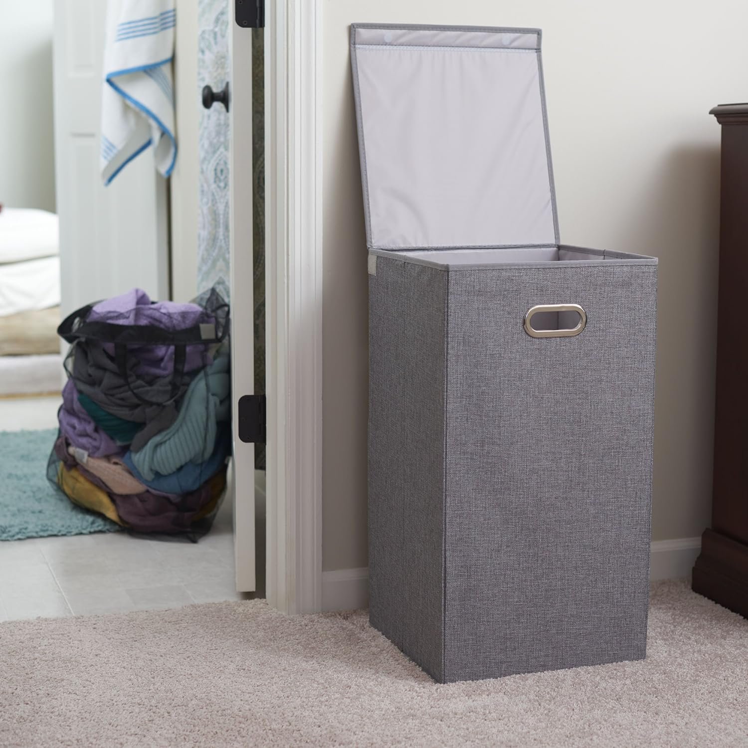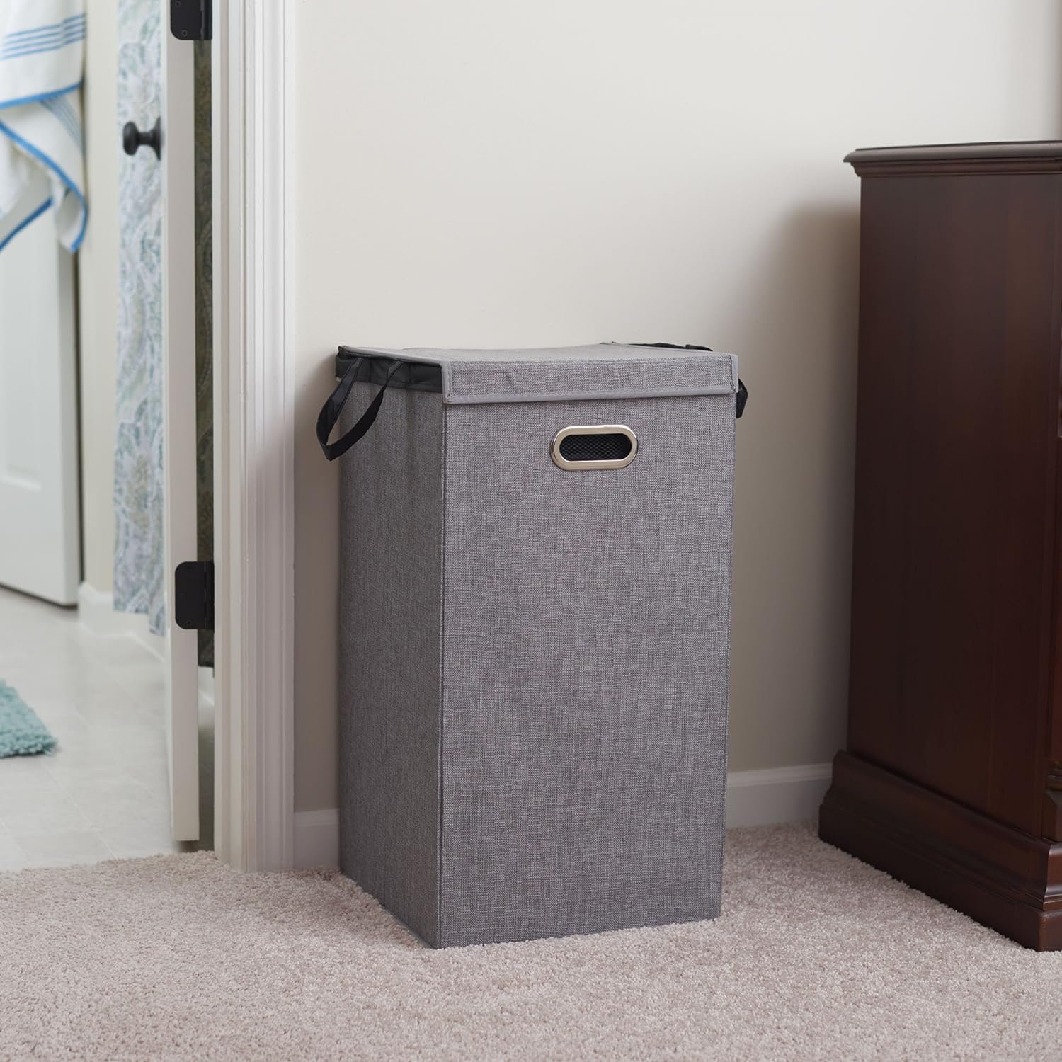 ATTACHED MAGNETIC LID keeps lid closed to cover dirty laundry