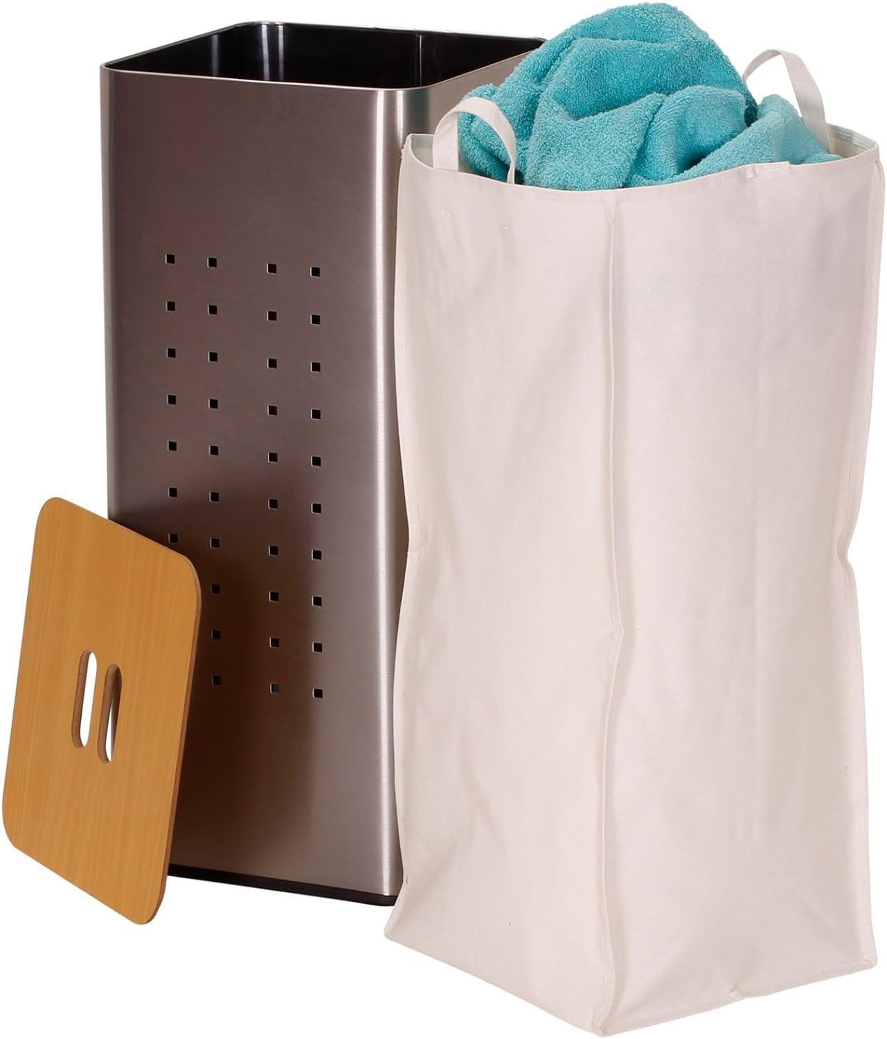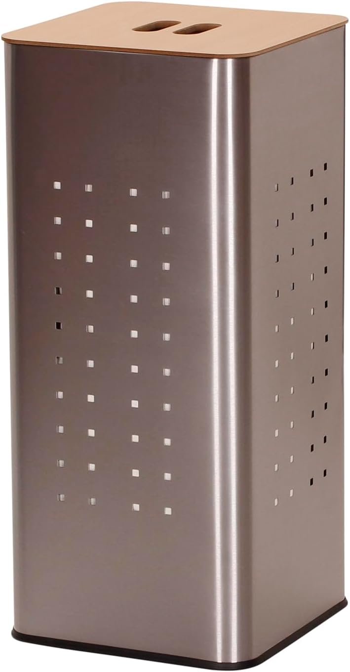 Household Essentials square metal laundry hamper with wood lid is modern take on the personal clothes hamper. Perfect for small space, this compact hamper holds 1-1. 5 loads of laundry in a 12. 25″ x 12. 25″ space and has a removable liner with handles for easy emptying. It stands 27. 5″H, making it convenient beside a desk or even as an end table. When space is at a premium, this stainless steel laundry hamper’s modern design and non-hamper-like look is ideal. It makes it usable in any room as a storage bin, clothes hamper, end table, or all of the above. Perfect for lofts, apartments, bedrooms, and dorms