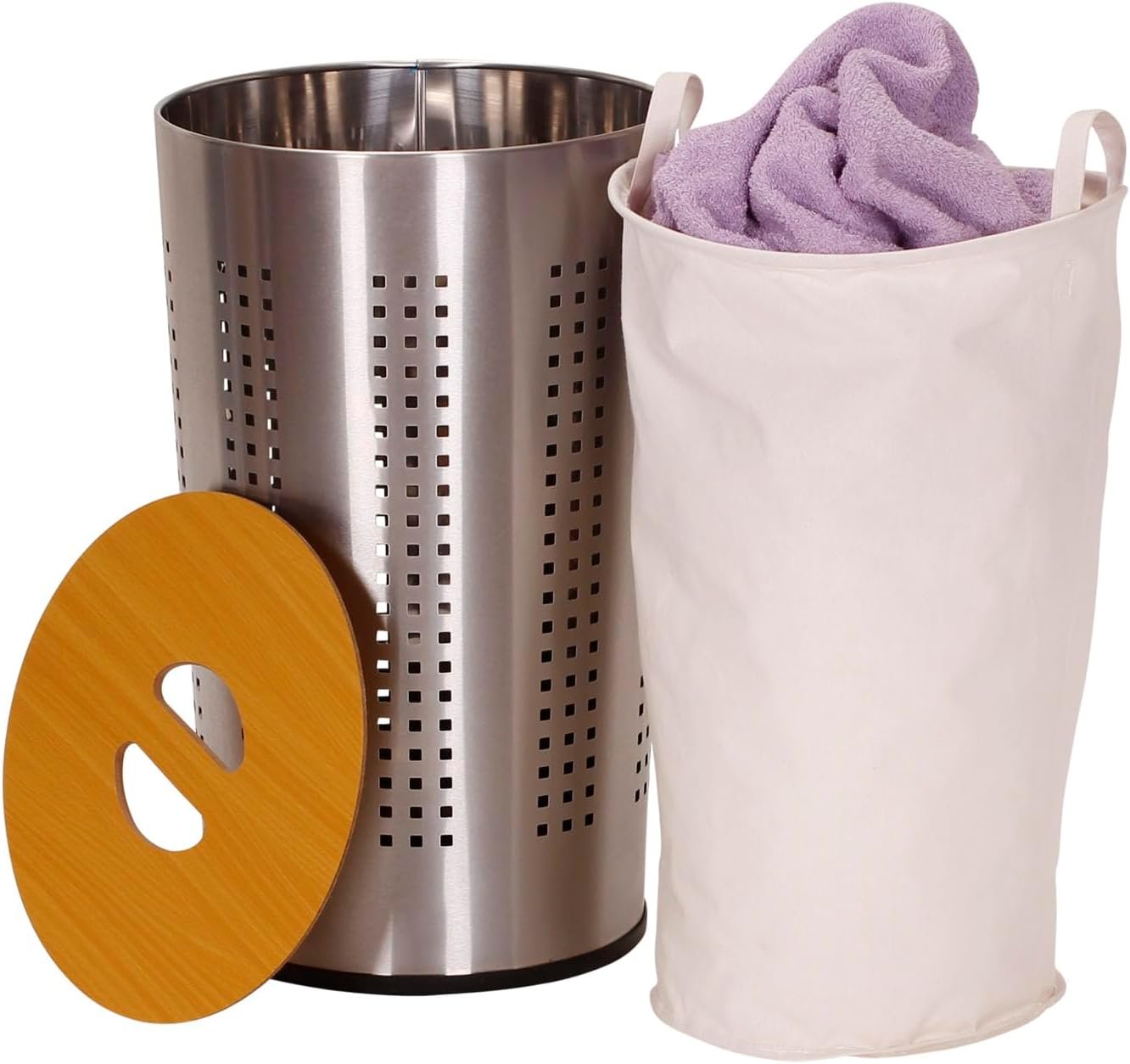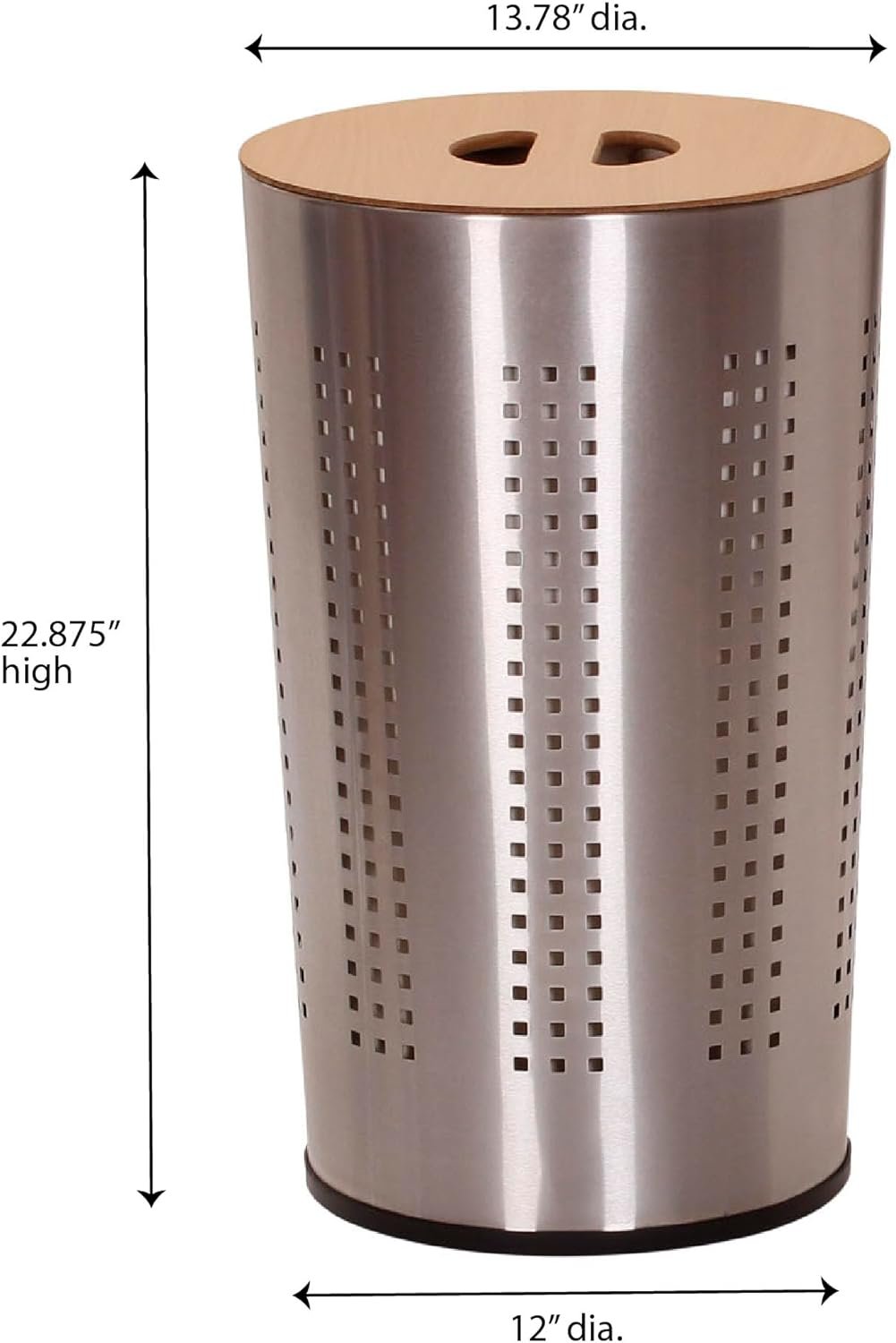 Reimagine the personal clothes hamper with the modern Household Essentials round metal laundry hamper with wood lid. This sleek individual laundry hamper is 13.78 inch dia and 22.875 inch H with a removable bag and a flat wood lid. That flat lid makes this hamper a much more versatile bedroom hamper, doubling as a side table. Perfect for lofts, apartments, dorms, and home, this compact stainless steel hamper is a bit of modern sophistication, a hamper that does not necessarily look like a hamper but that does the work of one perfectly.