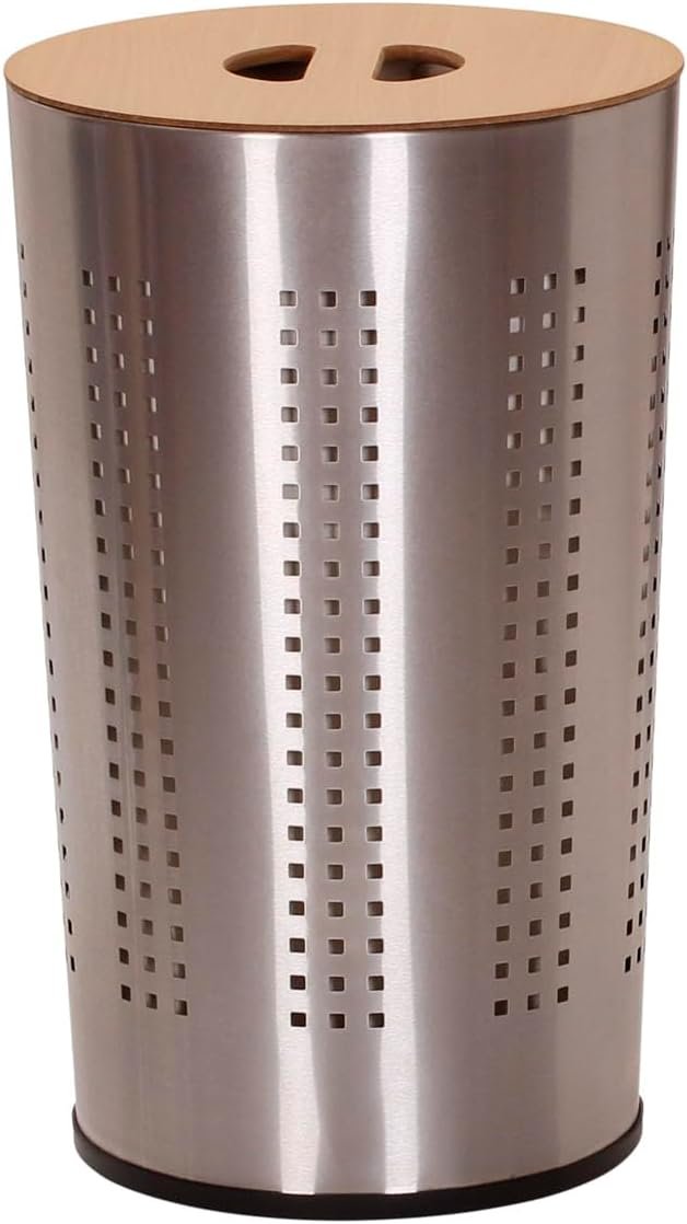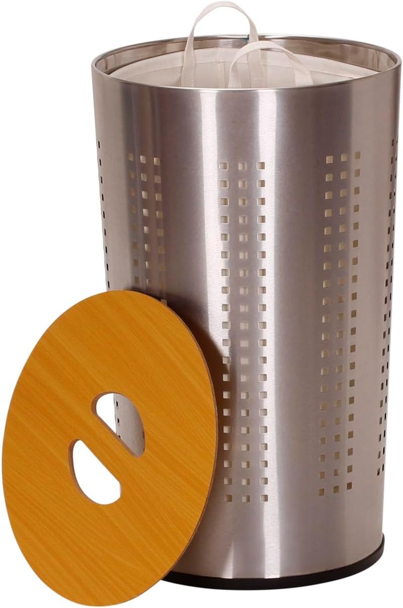 Stylish personal stainless steel round clothes hamper with removable liner and wooden lid for bedrooms and laundry rooms