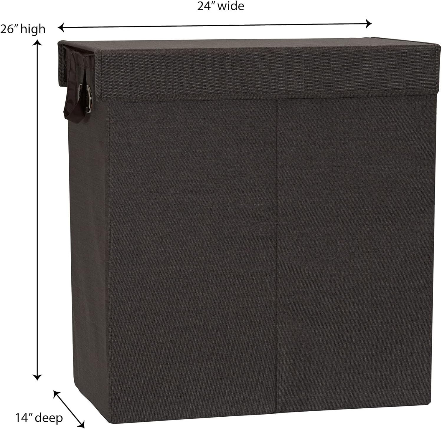 The HOUSEHOLD ESSENTIALS Collapsible Double Laundry Hamper Sorter has twice the holding power: it holds up to 4 loads of laundry in its 14 x 24 x 26 inch high frame! This clothes sorter is a 2 compartment clothes hamper with removable mesh bags that attach to the hamper so they stay open to fill! Perfect for home or dorm, it folds flat to store and unfolds to set up quickly and easily. With hard sides and fabric overlay that wipes clean with a damp cloth, it’s the perfect for keeping laundry covered. It even has detachable lid with a magnetic close to keep everything under wraps! 0