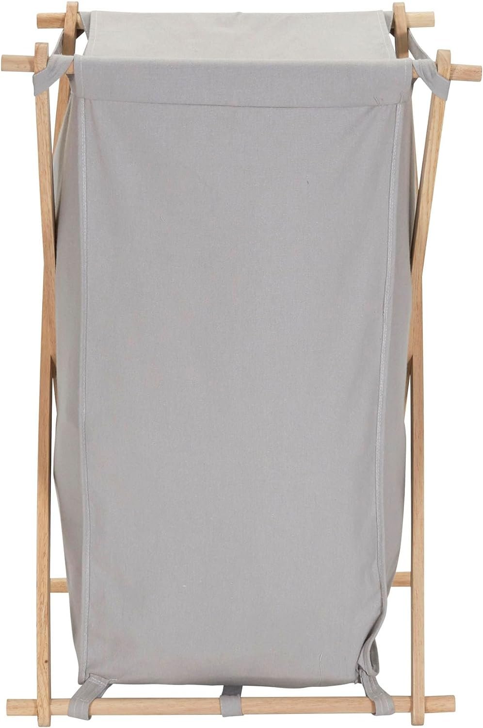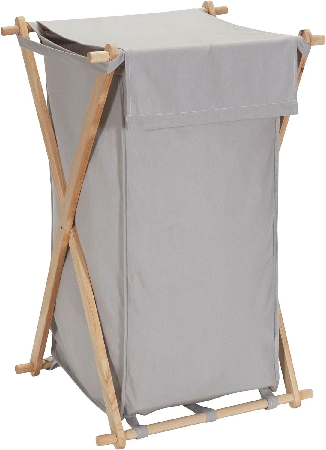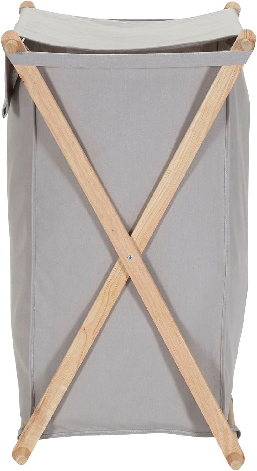 Sort, store, and haul laundry in HOUSEHOLD ESSENTIALS X-Frame Wood Laundry Hamper, a large capacity personal hamper that holds approximately 2 loads of laundry! This spacious hamper simplifies a hamper by using a strong, X-frame design. Raw rubber wood creates a collapsible frame that folds up to fit behind a door or in a closet, keeping the hamper out of the way when empty. The polycotton canvas bag is gray colored, with a drape lid that lays over the top of the hamper to hide what is inside. The bag hooks onto the frame with fabric loops, and attaches even more securely with hook and loop fasteners. The removable bag is machine washable with like colors (line dry), making it easy to haul dirty laundry out of the hamper (bag and all), and then wash everything (bag included!). Whether it be behind the door or in the closet, the hamper’s collapsible frame makes for easy storage while not in use. This hamper’s tall, slender outline makes it perfect for dorms, smaller bedrooms and apartments. No need for abnormally large baskets that take up excess space. Carry this hamper up and down stairs or across the house with ease; the soft fabric bag is a wonderful alternative to uncomfortable plastic handles. This X-frame laundry hamper is a naturally beautiful way to keep dirty clothes and linens off the floor. This hamper is ready to use in a flash with easy assembly with no tools required and comes with a 1-year manufacturer’s warranty.