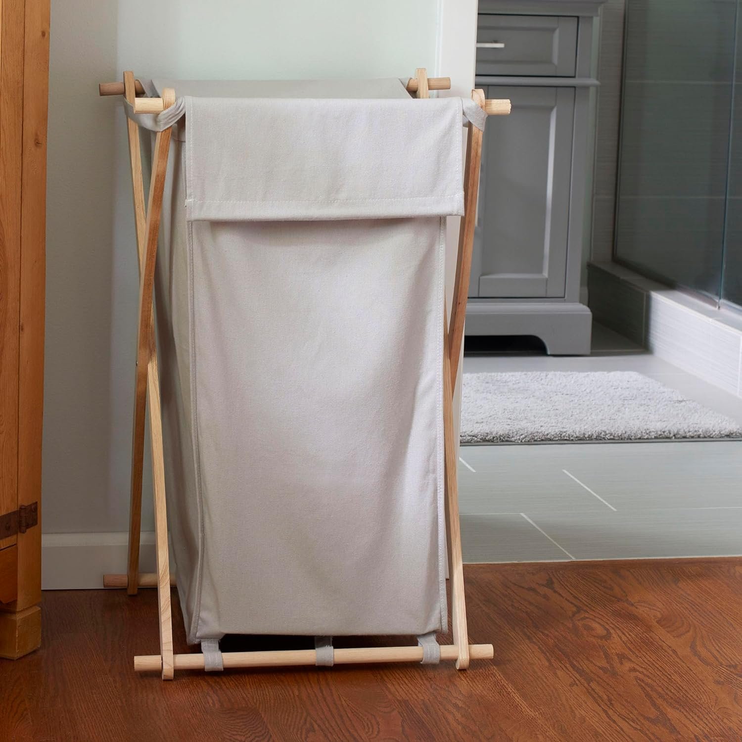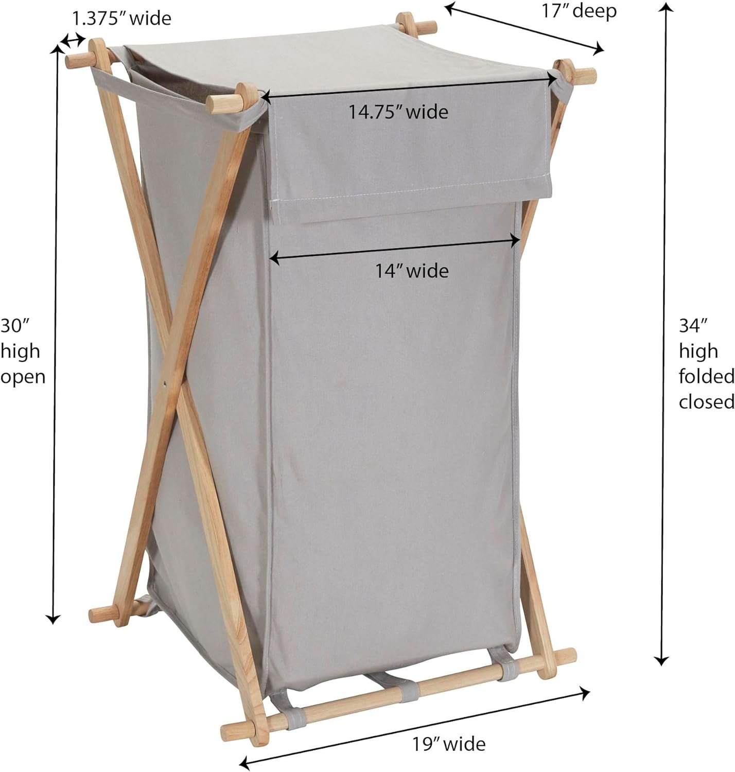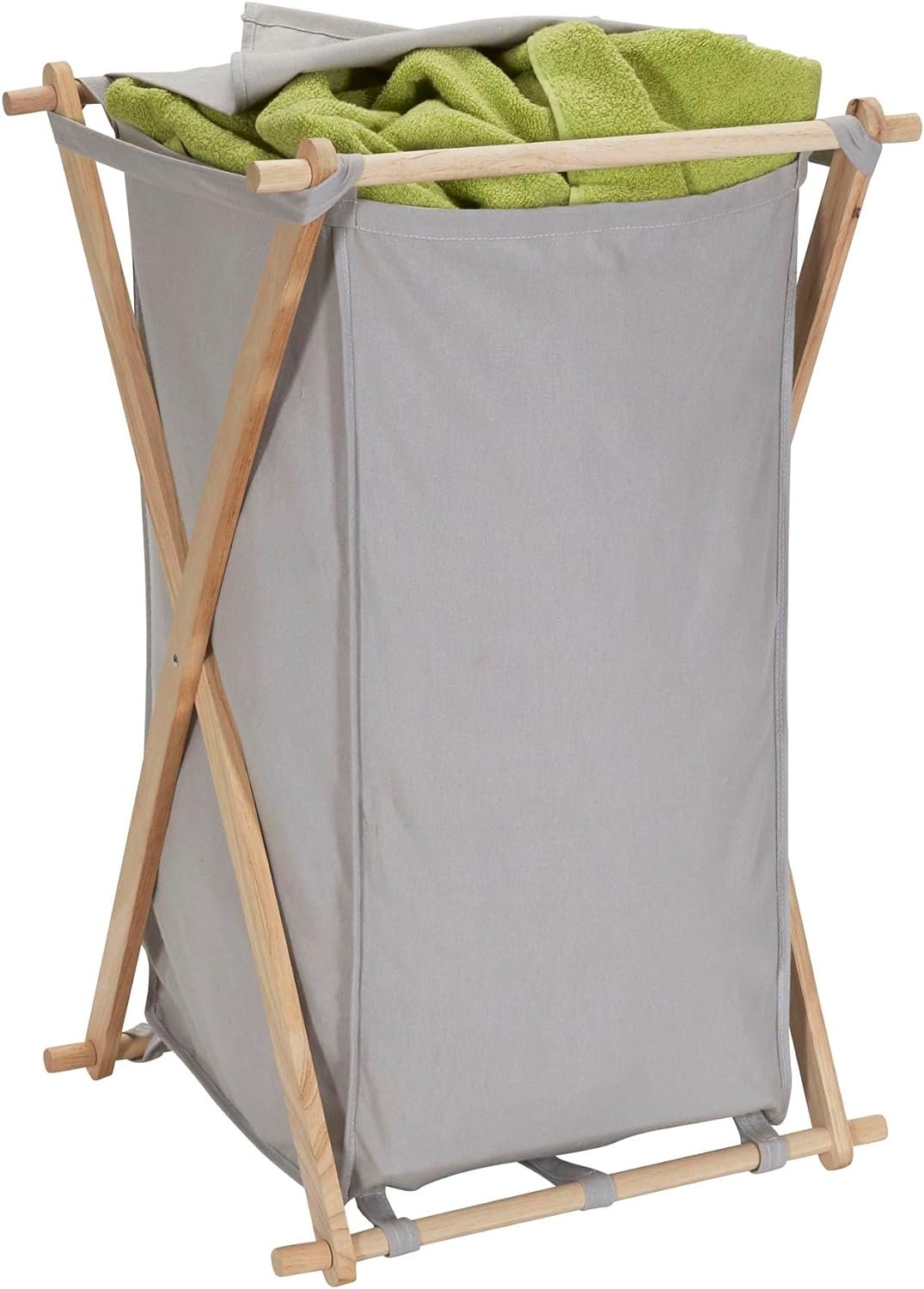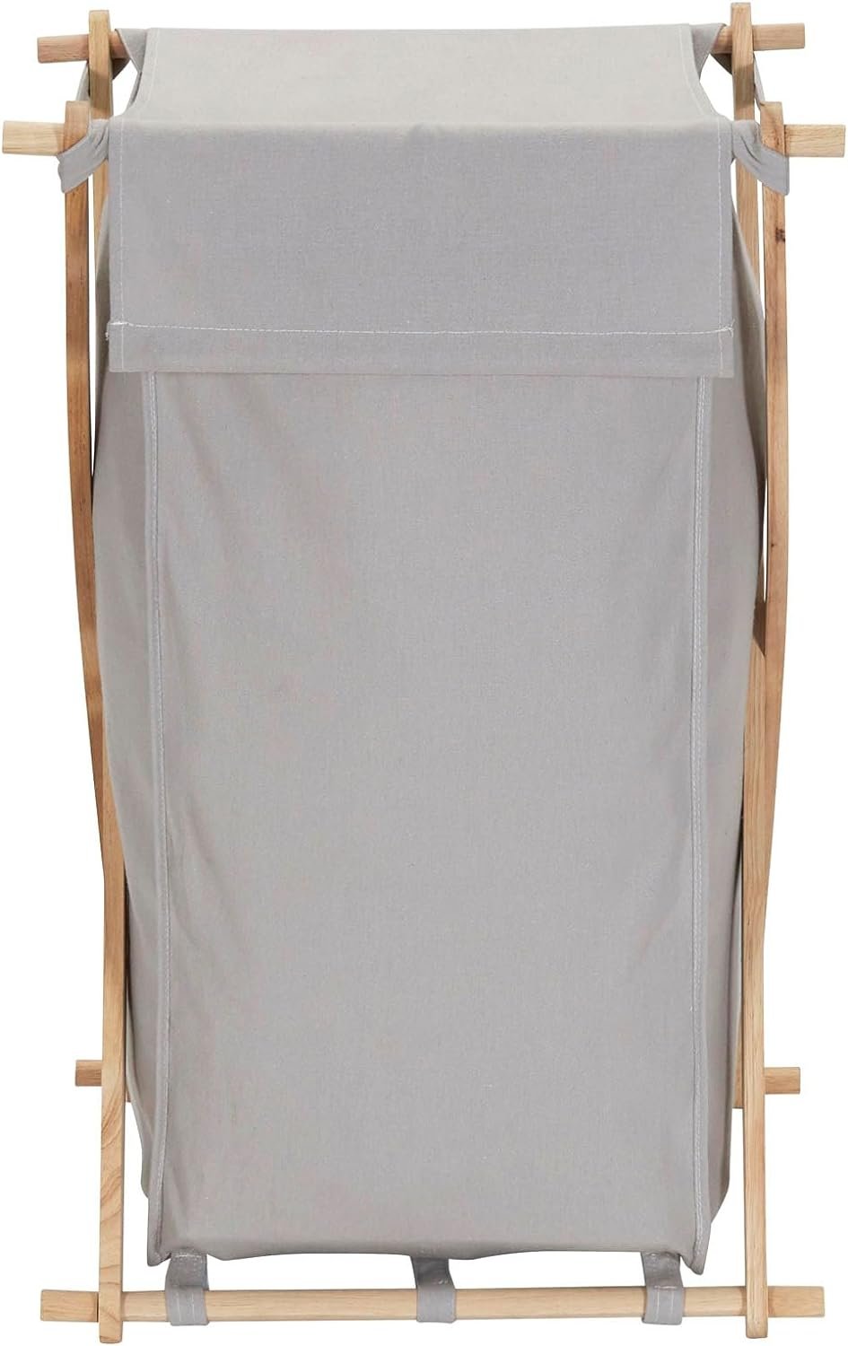 Sort, store, and haul laundry in HOUSEHOLD ESSENTIALS X-Frame Wood Laundry Hamper, a large capacity personal hamper that holds approximately 2 loads of laundry! This spacious hamper simplifies a hamper by using a strong, X-frame design. Raw rubber wood creates a collapsible frame that folds up to fit behind a door or in a closet, keeping the hamper out of the way when empty. The polycotton canvas bag is gray colored, with a drape lid that lays over the top of the hamper to hide what is inside. The bag hooks onto the frame with fabric loops, and attaches even more securely with hook and loop fasteners. The removable bag is machine washable with like colors (line dry), making it easy to haul dirty laundry out of the hamper (bag and all), and then wash everything (bag included!). Whether it be behind the door or in the closet, the hamper’s collapsible frame makes for easy storage while not in use. This hamper’s tall, slender outline makes it perfect for dorms, smaller bedrooms and apartments. No need for abnormally large baskets that take up excess space. Carry this hamper up and down stairs or across the house with ease; the soft fabric bag is a wonderful alternative to uncomfortable plastic handles. This X-frame laundry hamper is a naturally beautiful way to keep dirty clothes and linens off the floor. This hamper is ready to use in a flash with easy assembly with no tools required and comes with a 1-year manufacturer’s warranty.