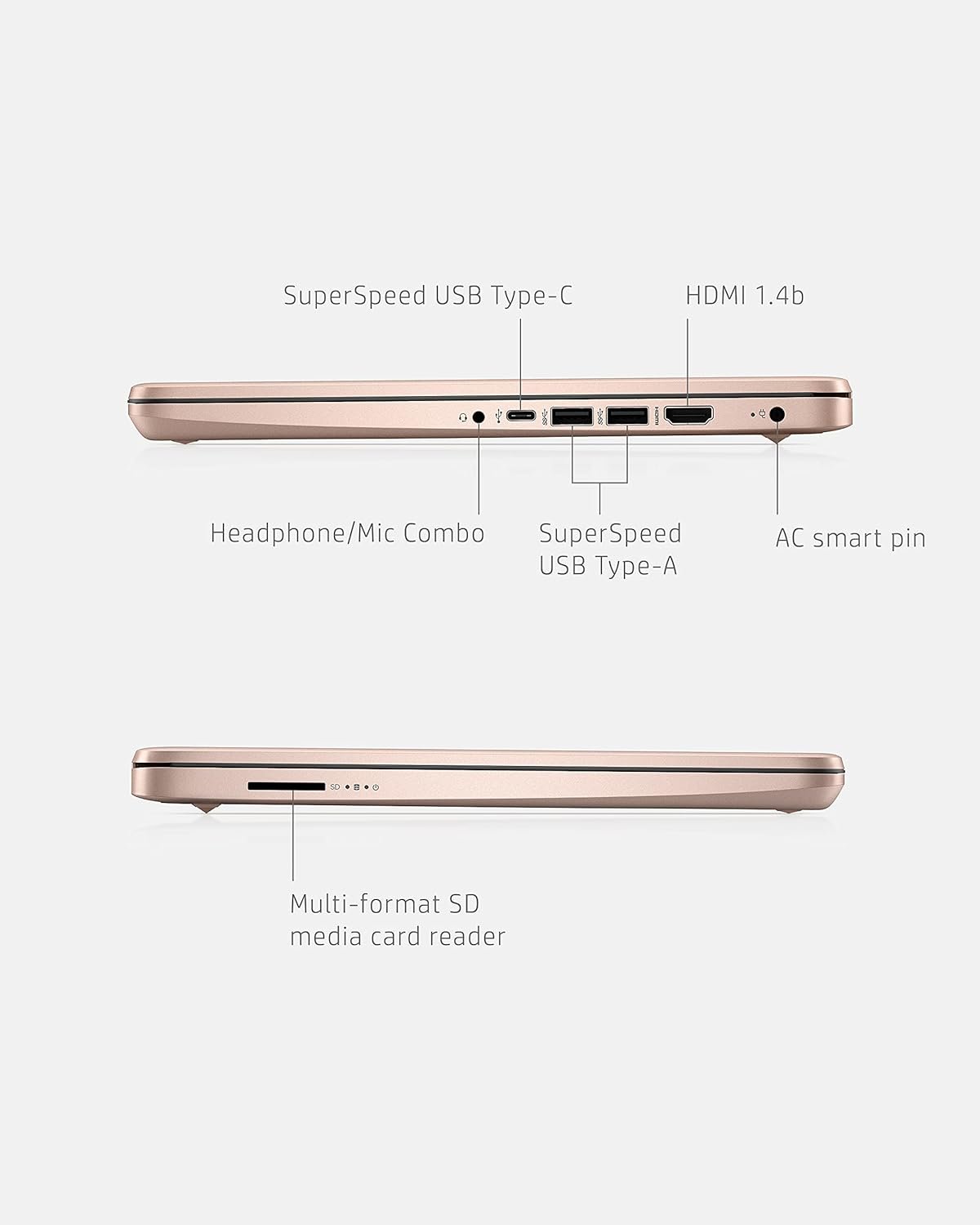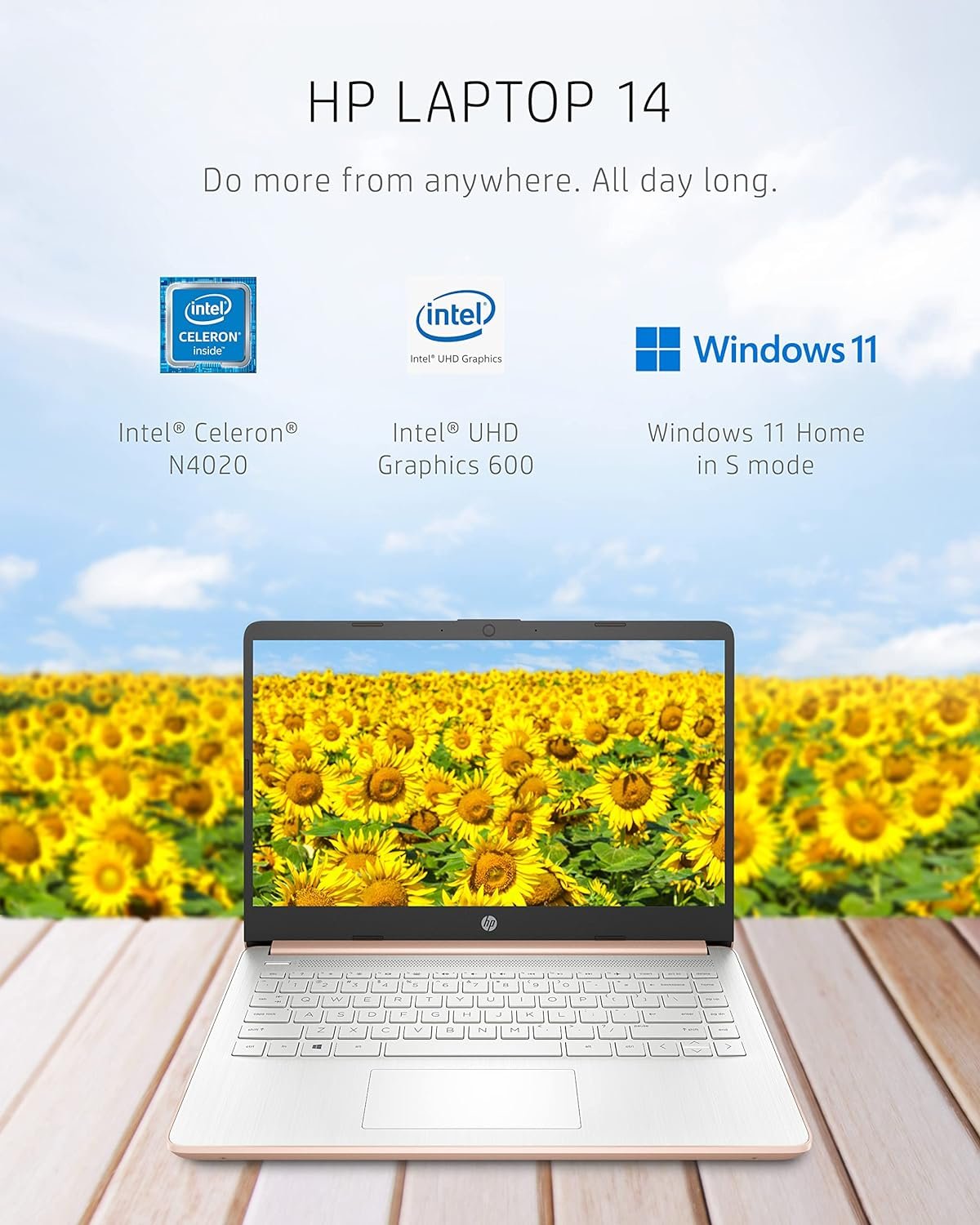 The Pale Rose Gold HP 14 Laptop is designed to keep you productive and entertained from anywhere. Maximize your viewing area and see every detail thanks to 6.5 mm micro-edge bezel display, 79% screen-to-body ratio, and 14-inch HD (1366 x 768) display (1) (2). Performance, power consumption, and value come together in the Intel® Celeron® N4020, the ideal processor for your busiest days (3). Enjoy the highest resolution games and movies with the 4K-ready Intel® UHD Graphics 600 (4) (5). Store more of what you love and multitask faster, even with multiple windows open, with this HP laptop’s 64 GB of eMMC storage and 4 GB of RAM (6). Up your creativity and efficiency as this HP 14-inch laptop offers even more features for computing from anywhere. Spend more time focused on your daily tasks and less on the battery life with up to 11 hours and 30 minutes of power (7). Plus, HP Fast Charge keeps you powered especially if you need recharge quickly (8). The exceedingly secure Windows 10 Home in S mode outfits your PC laptop with fast boot times, increased responsiveness, and added protection against phishing and malware (9). Work confidently with 1-year limited hardware warranty and stay connected with the dependable Wi-Fi 5 (1×1) and Bluetooth® 4.2 combo (10) (11). Boost your creativity as your Windows laptop comes with a 1-year subscription to Microsoft 365, including the whole Office Suite: Word, Excel, and PowerPoint (12). Productivity and entertainment features aren’t the only things your device is equipped with; lead a sustainable lifestyle with a thin laptop that is ENERGY STAR® certified and EPEAT® Silver registered (13) (14). (1) Percent of the active plus inactive viewing area to active viewing area plus border. Measure with lid vertical to the desk. (2) High-definition (HD) content is required to view high-definition images. (3) Multi-core is designed to improve the performance of certain software products. Not all customers or software applications will necessarily benefit from the use of this technology. Performance and clock frequency will vary depending on application workload and your hardware and software configurations. Intel’s numbering, branding, and/or naming is not a measurement of higher performance. Intel, Pentium, Intel Core, Celeron, Iris Xe, Intel logo, and the Intel Inside logo are trademarks of Intel Corporation in the U.S. and other countries. (4) Wireless access point and internet service required and sold separately. The availability of public wireless access points is limited. (5) Graphics output may be limited based on the maximum resolution of the display. Shared video memory (UMA) uses part of the total system memory for video performance. System memory dedicated to video performance is not available for other use by other programs. (6) For storage drives, GB = 1 billion bytes. The actual formatted capacity is less. Up to 5.1GB of disk is reserved for system recovery software. (7) Battery life tested by HP using continuous FHD video playback, 1080p (1920×1080) resolution, 150 nits brightness, system audio level at 17%, player audio level at 100%, played full-screen from local storage, headphone attached, wireless on but not connected. Actual battery life will vary depending on configuration and maximum capacity will naturally decrease with time and usage. (8) Features may require software or other 3rd party applications to provide the described functionality. Internet service required and not included. (9) Not all features are available in all editions or versions of Windows. Systems may require upgraded and/or separately purchased hardware, drivers, software, or BIOS update to take full advantage of Windows functionality. Windows 10 is automatically updated, which is always enabled. ISP fees may apply and additional requirements may apply over time for updates. Windows 10 Home (S mode) works exclusively with apps from the Microsoft Store within Windows. Certain default settings, features, and apps cannot be changed. Some accessories and apps compatible with Windows 10 may not work (including some antivirus, PDF Writers, driver utilities, and accessibility apps) and performance may vary, even if you switch to Windows 10 Home configuration (fee may apply). You can’t switch back to Windows 10 Home (S mode). Learn more at Windows.com/Windows10SFAQ. (10) Wireless access point and internet service required and sold separately. The availability of public wireless access points is limited. Wi-Fi 5 (802.11ac) is backward compatible with prior Wi-Fi 5 specs. (11) Bluetooth® is a trademark owned by its proprietor and used by Hewlett-Packard Company under license. (12) Microsoft 365 Personal 1-year subscription included. Activation is required within 6-months of the Windows activation date. Microsoft 365 Family and Microsoft 365 Personal have non-commercial rights and are meant for personal use only. See microsoft.com for full details. (13) ENERGY STAR and the ENERGY STAR mark are registered trademarks owned by the U.S. Environmental Protection Agency. (14) Based on U.S. EPEAT® registration according to IEEE 1680.1-2018 EPEAT®. EPEAT® status varies by country.