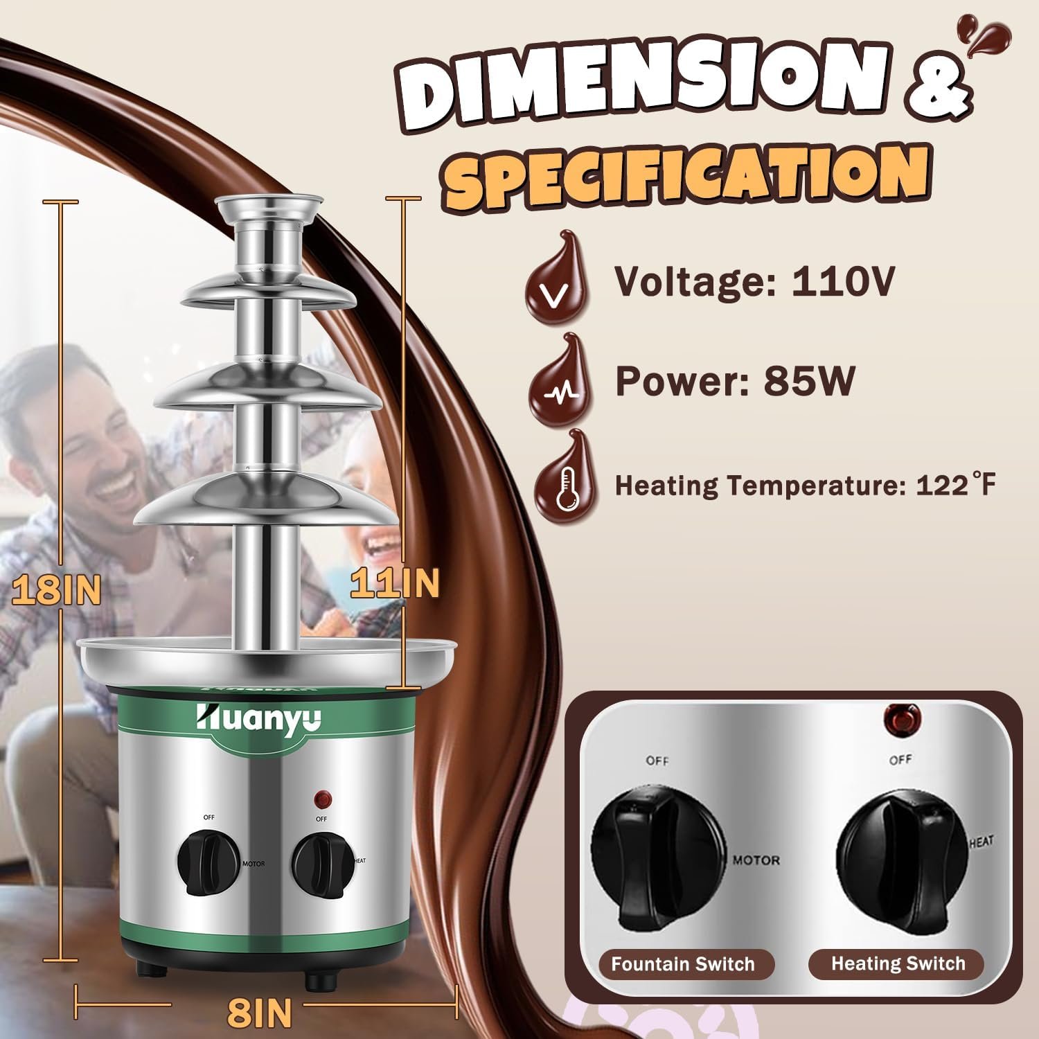 【Parameter Introductions】 4 Tier. Height: 18inch. Diameter of heating bowl: 8.27inch. Hold up to 3lbs of melted chocolate (The actual capacity is affected by the consistency of the sauce used). Temperature control range: 32-122℉. It is best not to exceed 2 hours for a single continuous use.