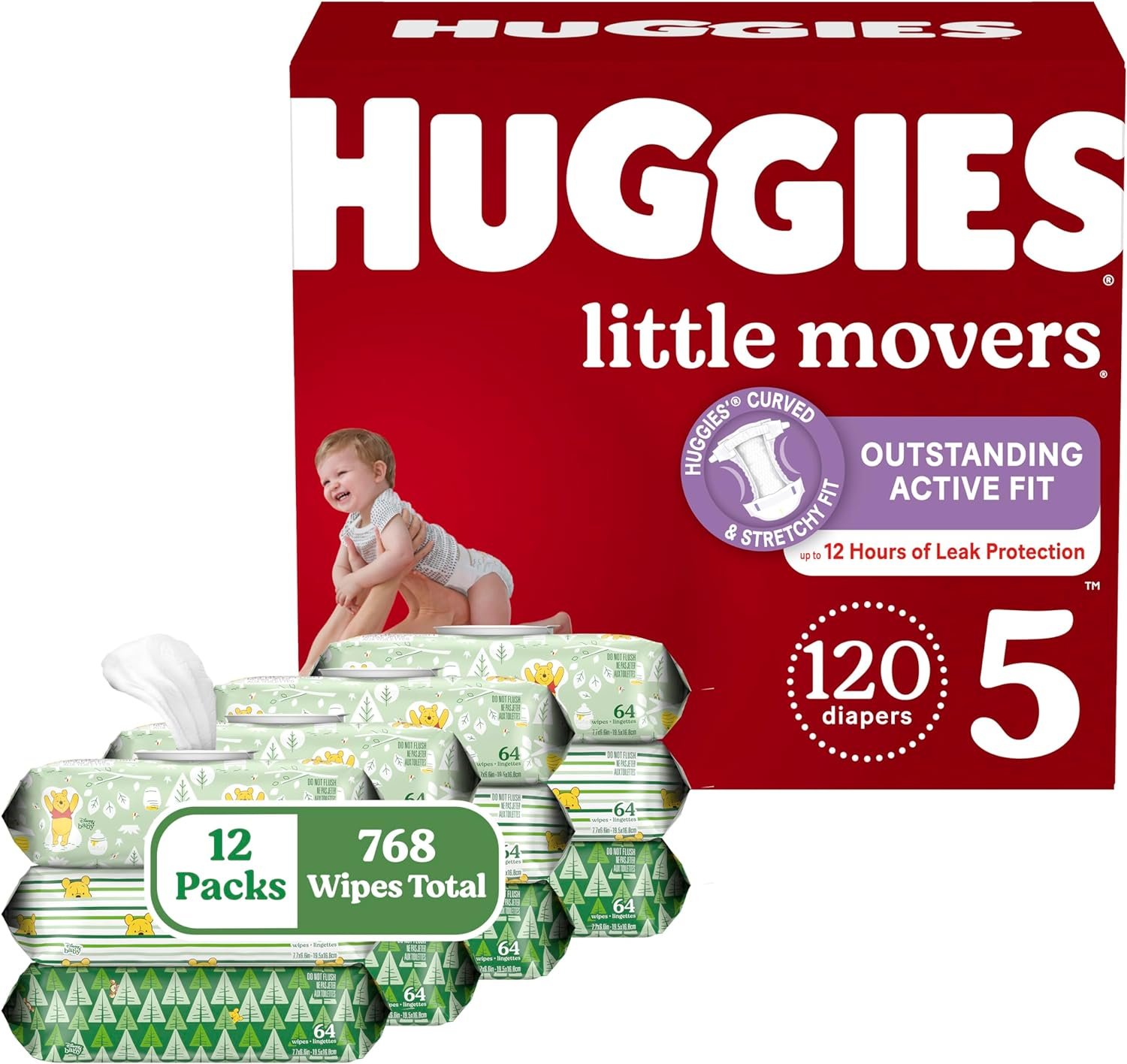 Bundle includes: Huggies Little Movers Baby Diapers, Size 5 (120 Count) & Huggies Natural Care Sensitive Wipes, Unscented, 12 Flip-Top Packs (768 Wipes Total). Packaging May Vary