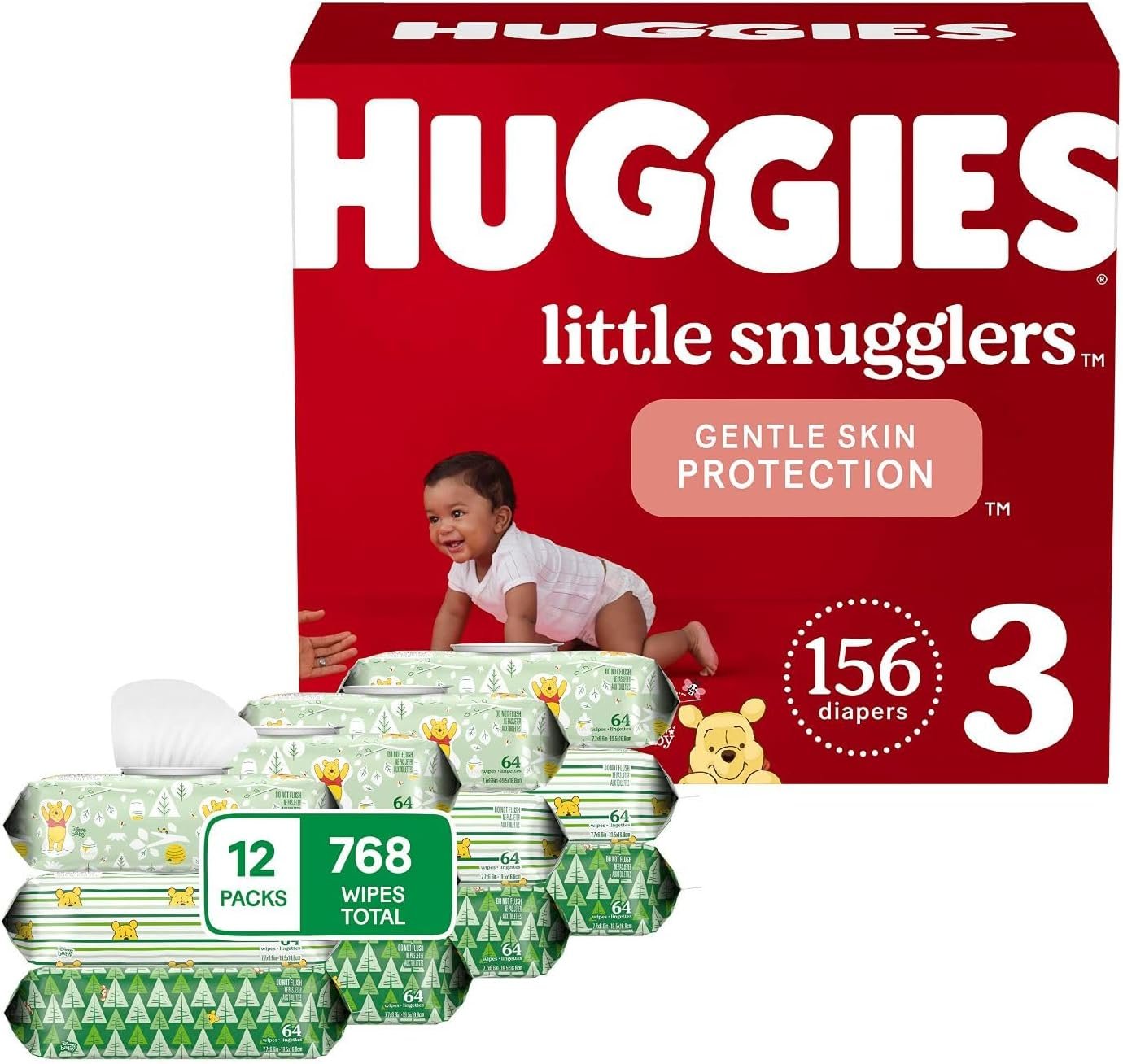 Bundle includes: Huggies Little Snugglers Baby Diapers, Size 3 (156 Count) & Huggies Natural Care Sensitive Wipes, Unscented, 12 Flip-Top Packs (768 Wipes Total). Packaging May Vary