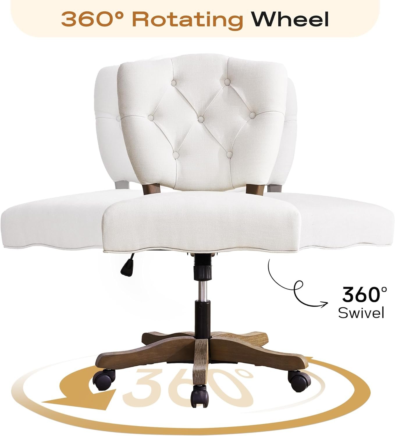 HUIMO Upholstered Swivel Desk Chair Chenille Tufted Fabric Home Office Chair with Wheels Adjustable Height Classic Task Chair with Wooden Legs Comfortable Armless Chair for Studio Study (Beige)