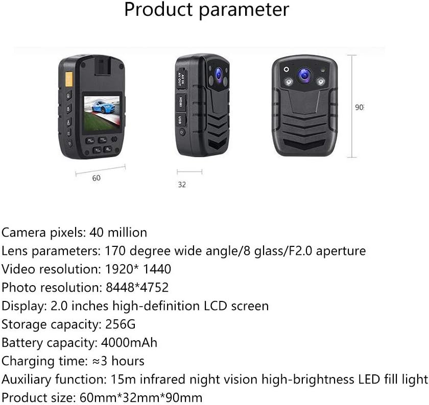 Camera pixels: 40 million Lens parameters: 170 degree wide angle/8 glass/F2.0 aperture Video resolution: 1920* 1440 Photo resolution: 8448*4752 Display: 2.0-inch high-definition LCD screen Storage capacity: 256G Battery capacity: 4000mAh Charging time: ≈3 hours Auxiliary function: 15m infrared night vision high-brightness LED fill light Product size: 60mm*32mm*90mm Note: Due to different shooting lights and displays, the product pictures will have different degrees of color difference. Because the product size is measured manually, there is a difference of ±1cm, the data is for reference only, please refer to the actual product, please understand!