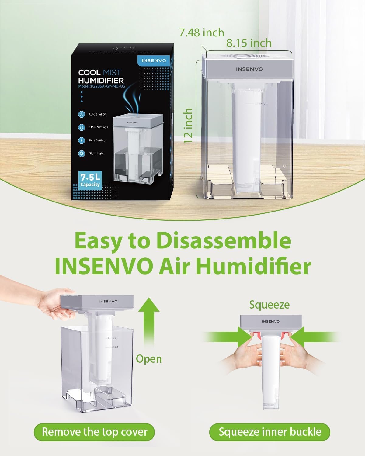 【Easy to Clean】Easy to disassemble and clean. Firstly, take off the top cover. Secondly, remove the inner barrel. Thirdly, brush the top cover and wash the humidifier from the top. The packing list: 1x INSENVO Air Humidifier, 1x Humidifier product manual, 1x Cleaning dedicated brush, 1x Power adapter.