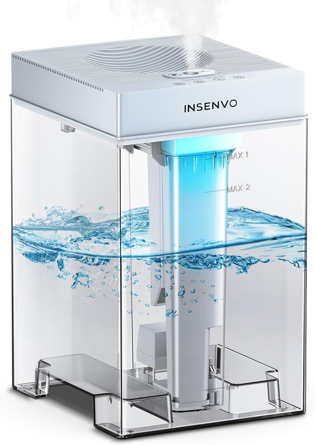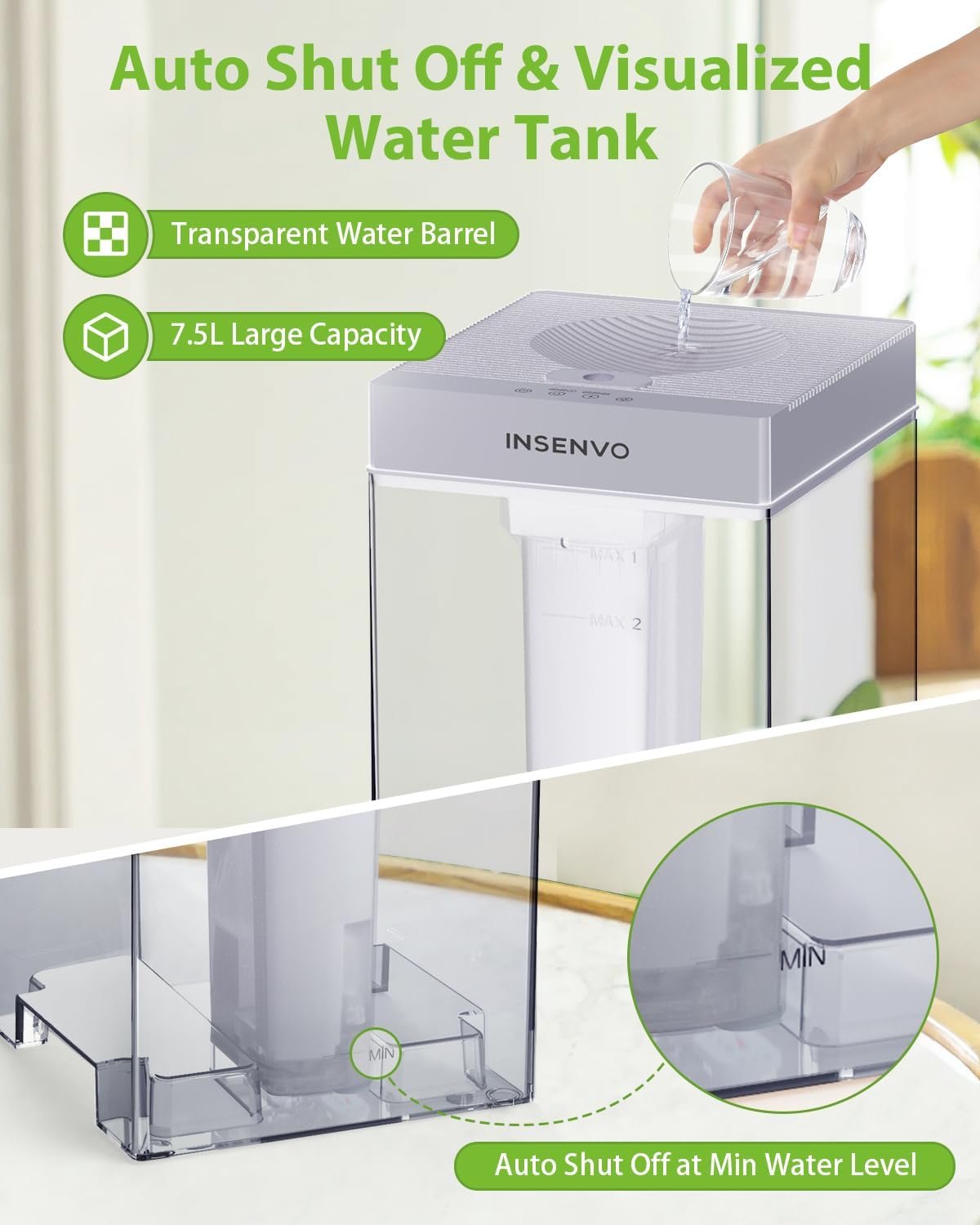【Anti-leak Design】Top fill water design&Top installed electronic motherboard. Effectively avoid the water leakage and water overflow the main board short-circuit. Visualization special outlook of INSENVO Humidifier, easy to see&control the water volume. Humanly portable bottom base, move it easily.
