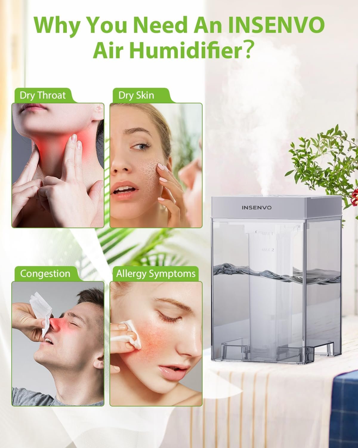 【Improvement Dry Air】7.5L INSENVO ultrasonic cool mist air humidifier can moisture the dry air, adjust the indoor humidity for breathing fresher air. It can relieve dry skin, cough, throat uncomfortable issues, keeping a moist respiratory tract. Creating a better health air arrounding for your family, pets and plants.