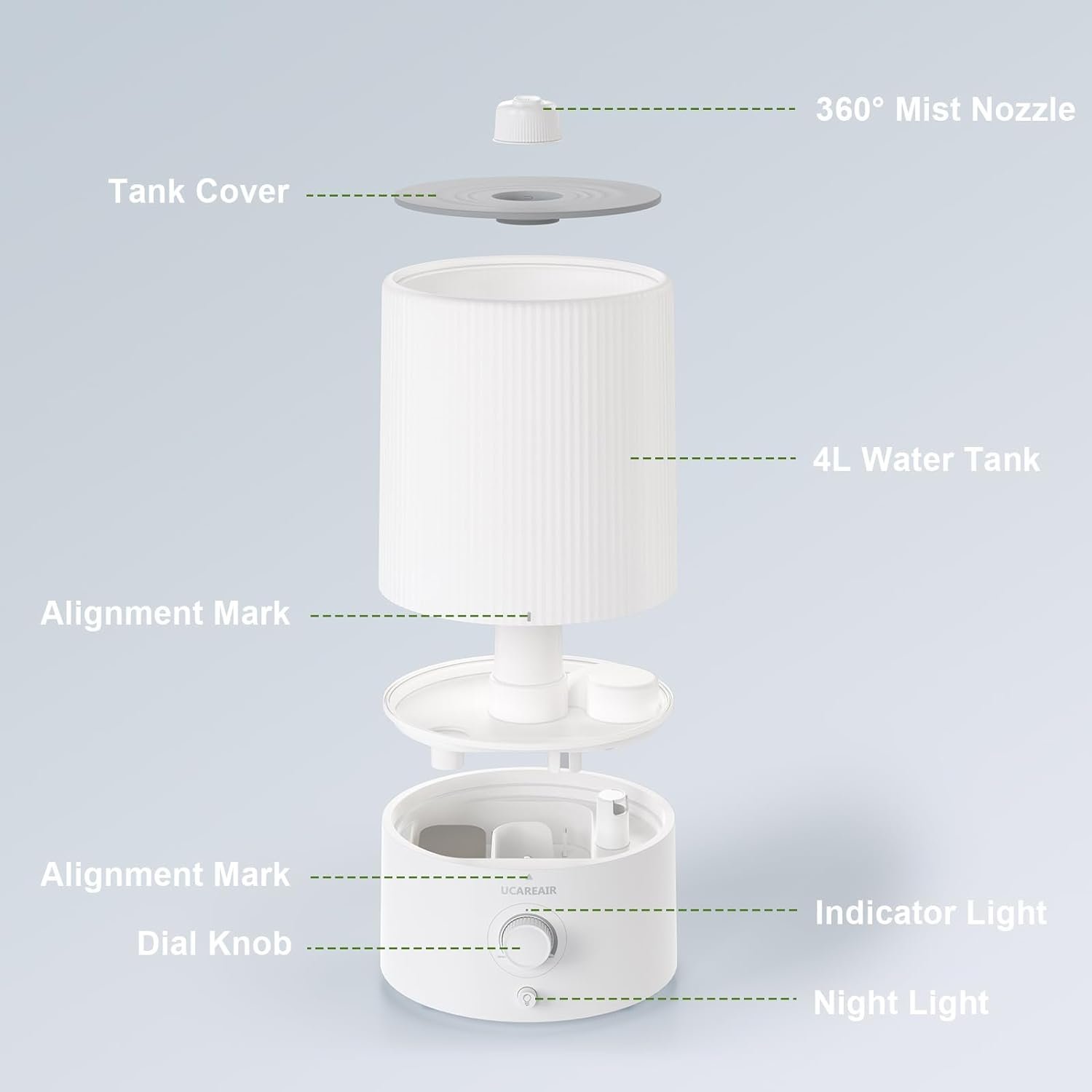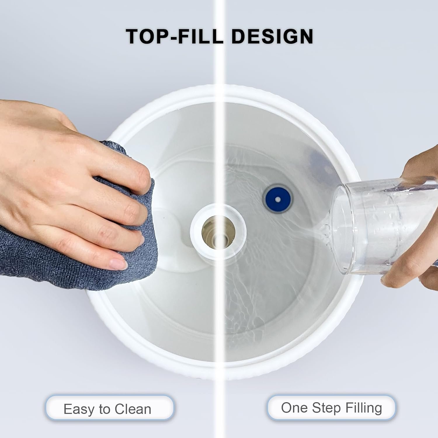 【Easy Top Fill Design】: The top fill humidifiers for bedroom boasts a practical top-fill design with a generously sized opening that simplifies refilling and cleaning without the need to detach the water tank. Bid farewell to frustrating leaks.