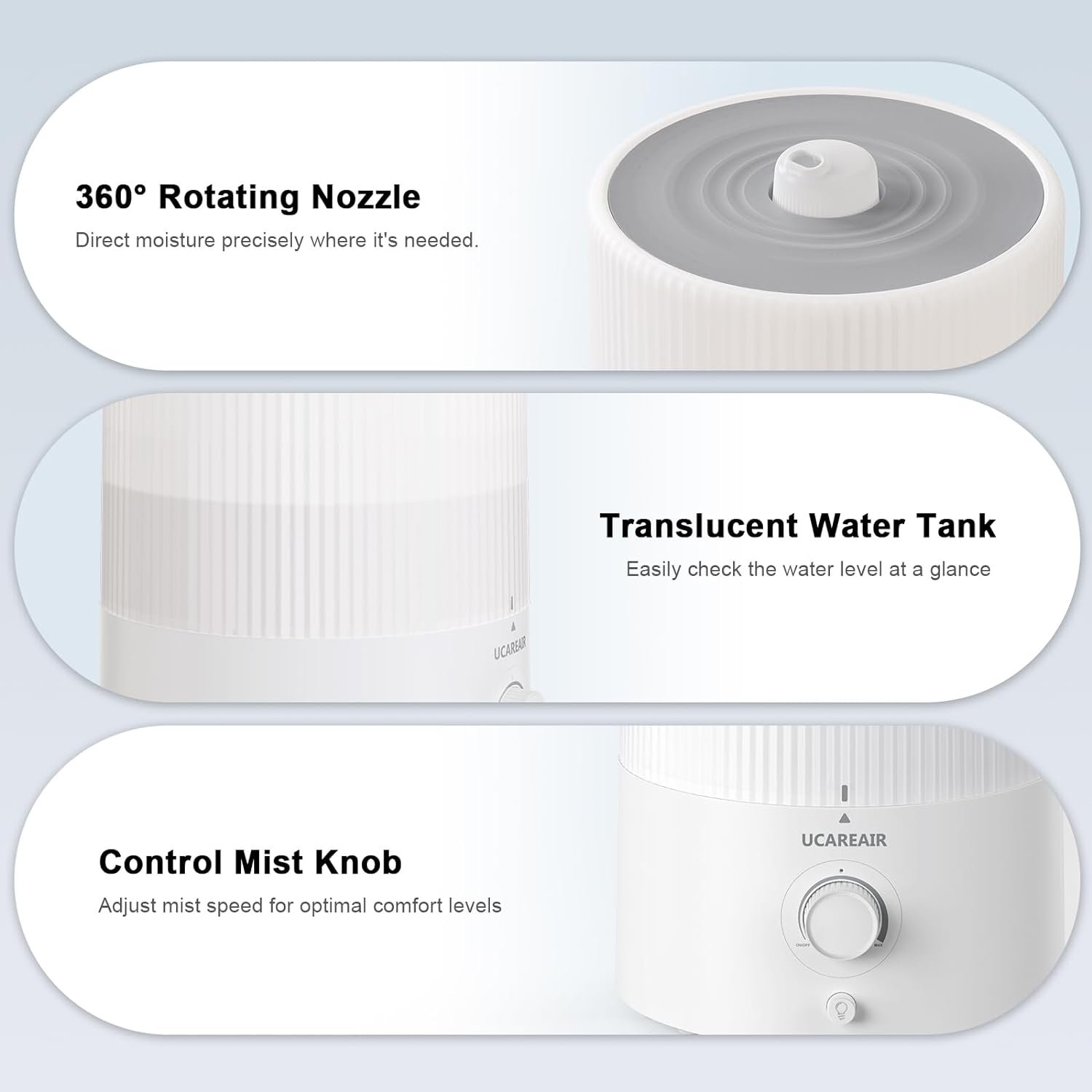 【Safe and Easy to Use】: Room humidifiers for bedroom quiet easy clean have a singular knob and 360°rotating nozzle that allows for simple adjustments to the mist’s direction and output. Achieving ideal air moisture is effortless, which can enhance the air you breathe. A safety feature automatically shuts off the humidifier when water levels are low, eliminating risks and damage.