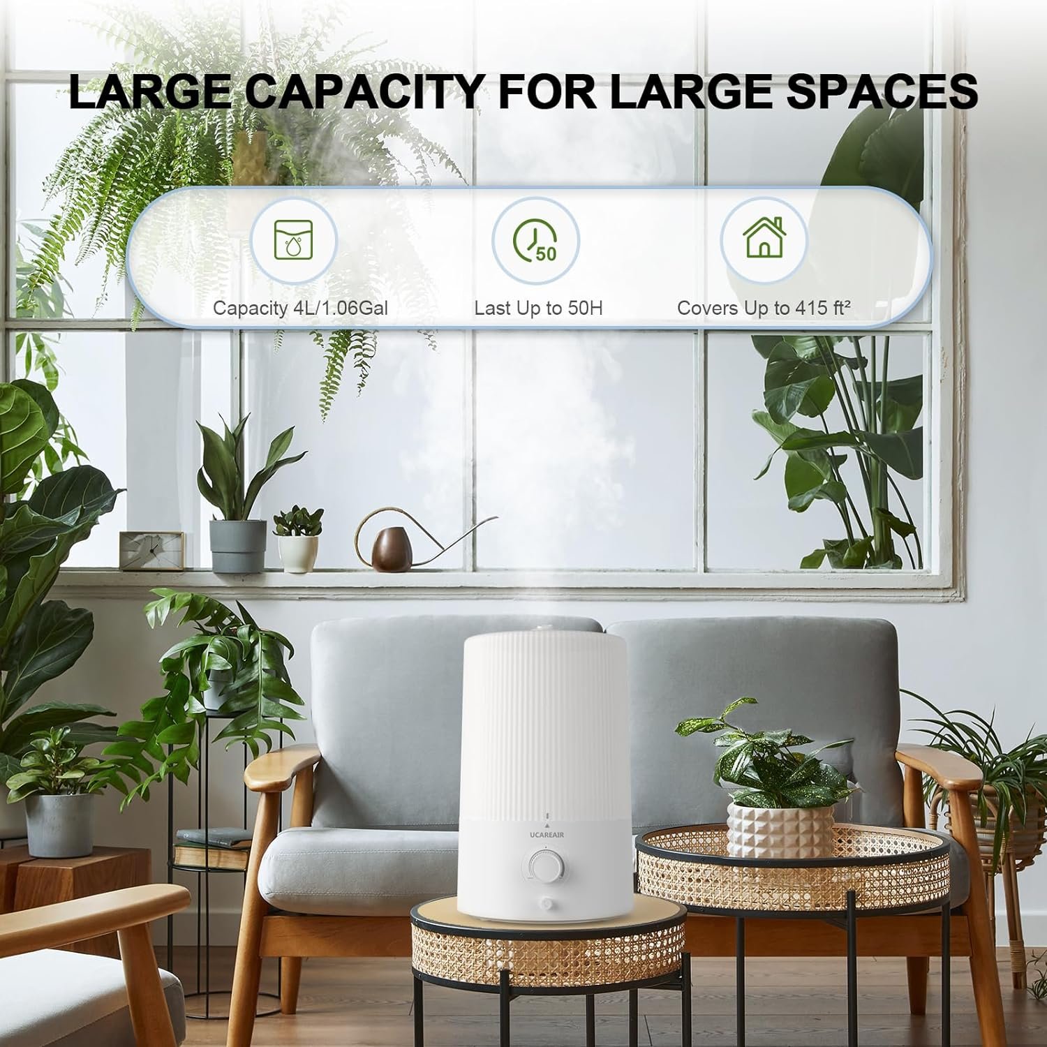 【Long Lasting & Less Refills】: The cool mist humidifiers for bedroom with a 4-litre water tank provide up to 50 hours of continuous operation. It helps ease congestion, dryness, and discomfort while ensuring prolonged and steady humidification for your bedroom. The air humidifiers for bedroom can humidify rooms of up to 415 sq. ft., making them ideal for home, offices, plants, and large rooms.