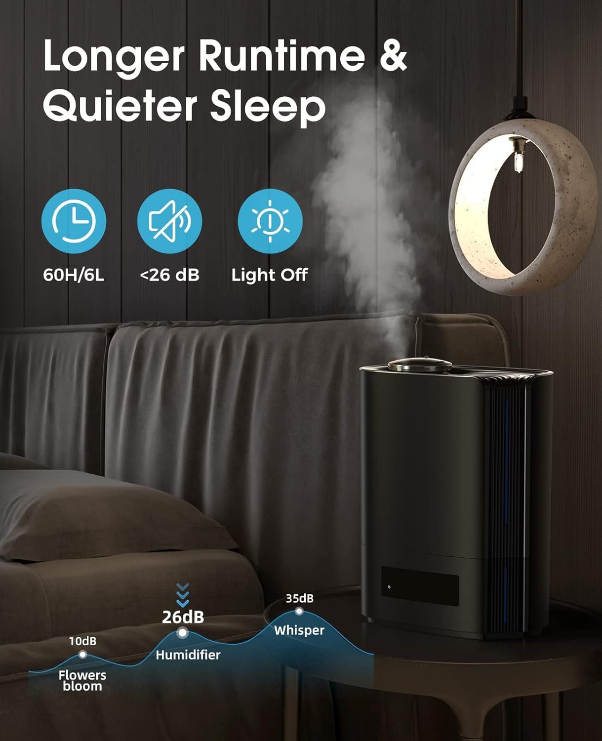【QUIETER WORK FOR YOU】Enjoy a peaceful sleep with this humidifier’s silent operation, with running sound less than 26dB. Its 7 colored lights can be turned off individually.A good choice for bedroom humidifiers!