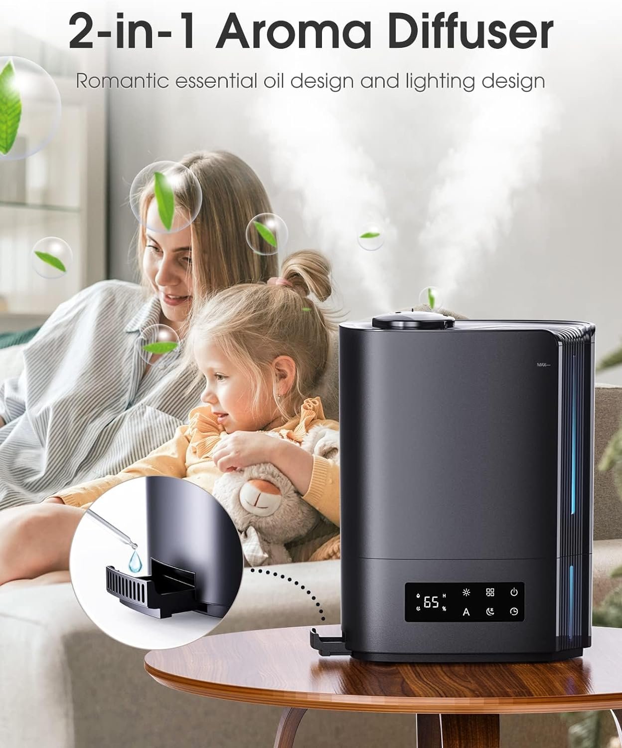 【HUMIDIFIER and DIFFUSER 2 IN 1】Equipped with a tray on the side, just add 4-5 drops of essential oils to release a charming fragrance throughout your space. Plus, its 360° adjustable mist nozzle allows you to direct the mist where you need it most.