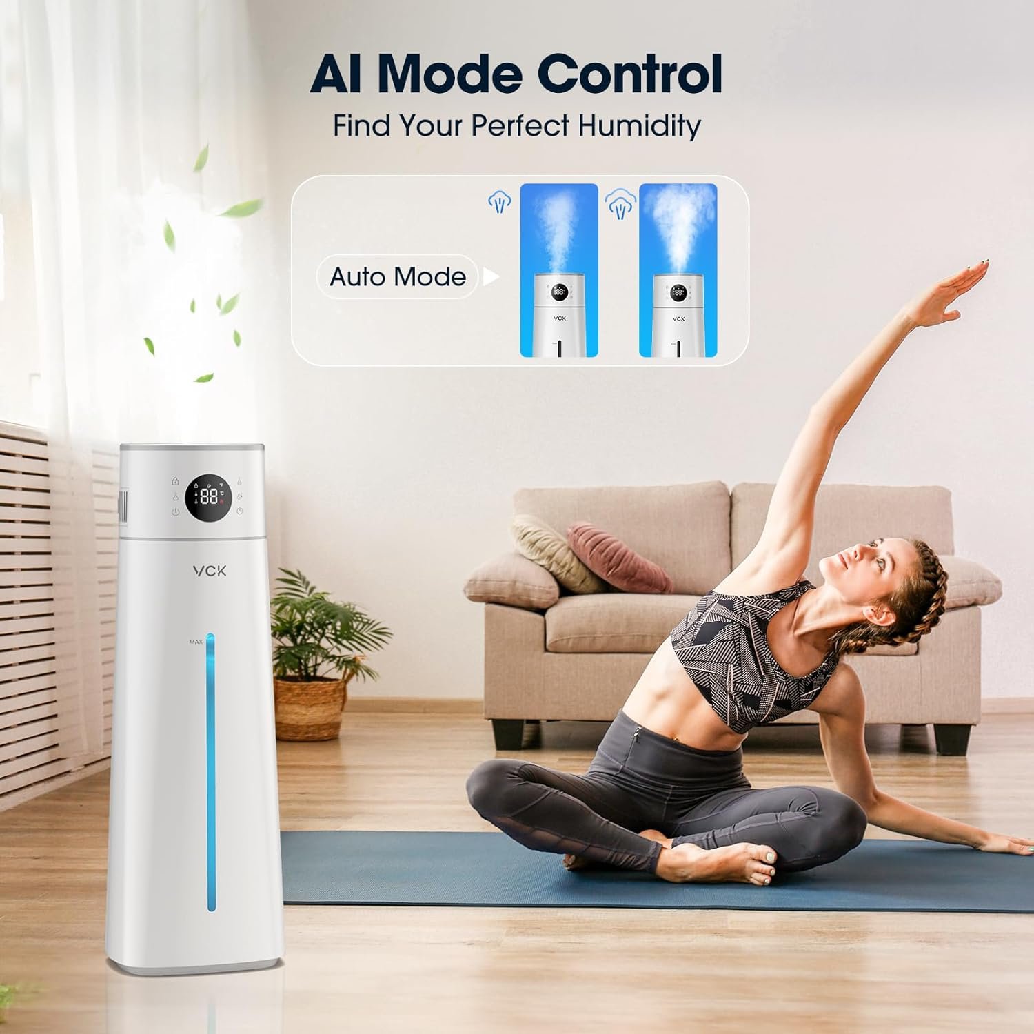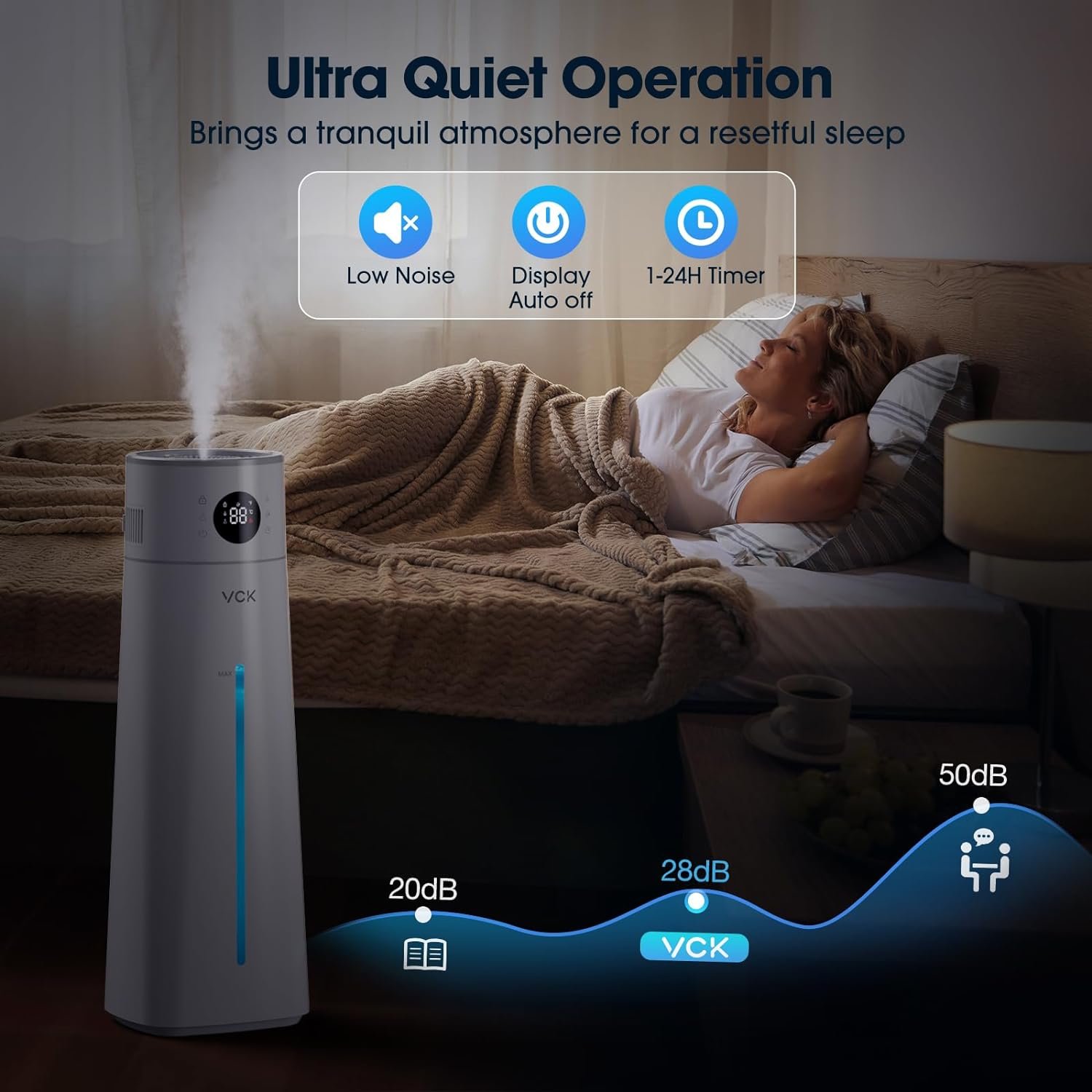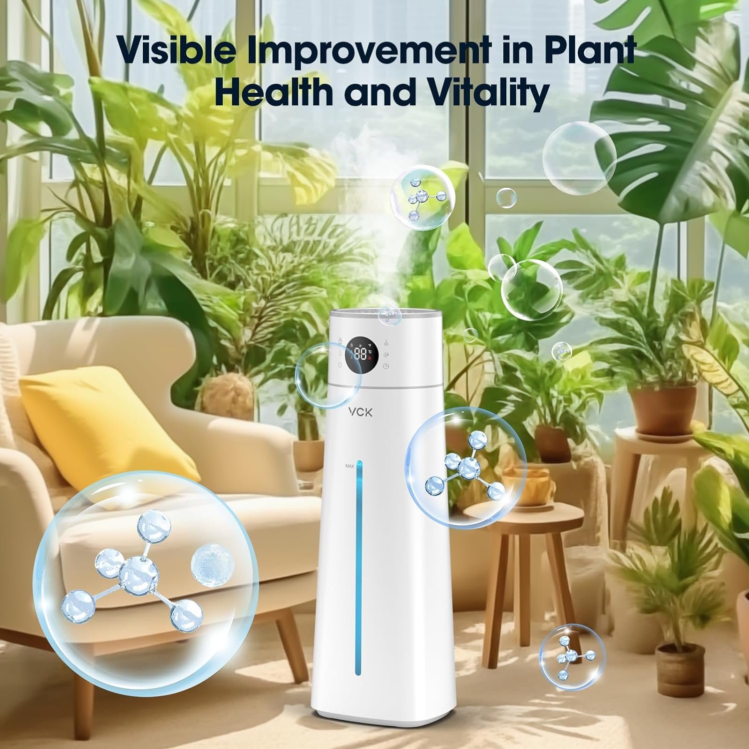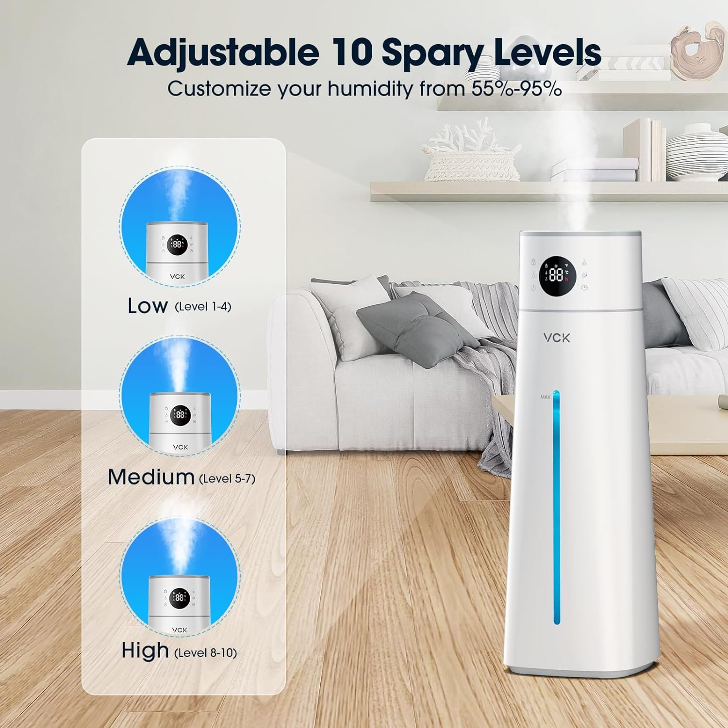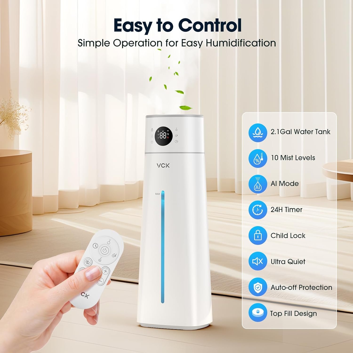 【Enhanced Safety Design】VCK humidifiers is packed with features designed to make your life easier and safer. The humidifier will automatically shutdown once the tank is lack of water, preventing any potential damage or overheating. We understand the importance of child safety, so this air humidifier also includes a child lock feature, providing an extra layer of protection and peace of mind for parents.