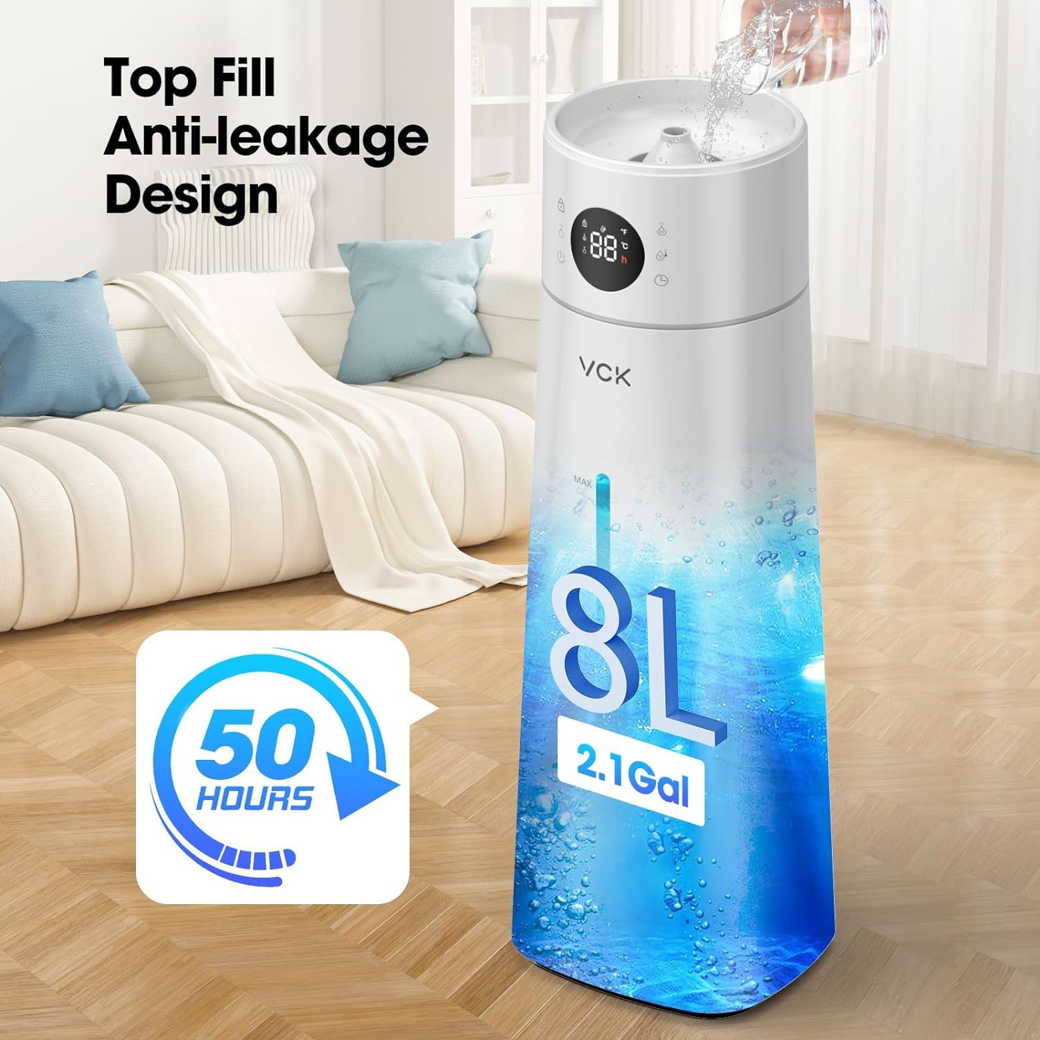 【8L Large Humidifier for Home】This large humidifier is equipped with a generous 8L/2.1Gal removable water tank, ensuring up to 50 hours of continuous operation.The powerful mist output of 300mL/h effectively humidifies spaces up to 500 sq.ft, whether it’s for whole-house use, bedrooms, large rooms, offices, plants, or any space prone to dryness, this humidifier is the perfect solution. Say goodbye to dryness and enjoy a well-humidified environment.