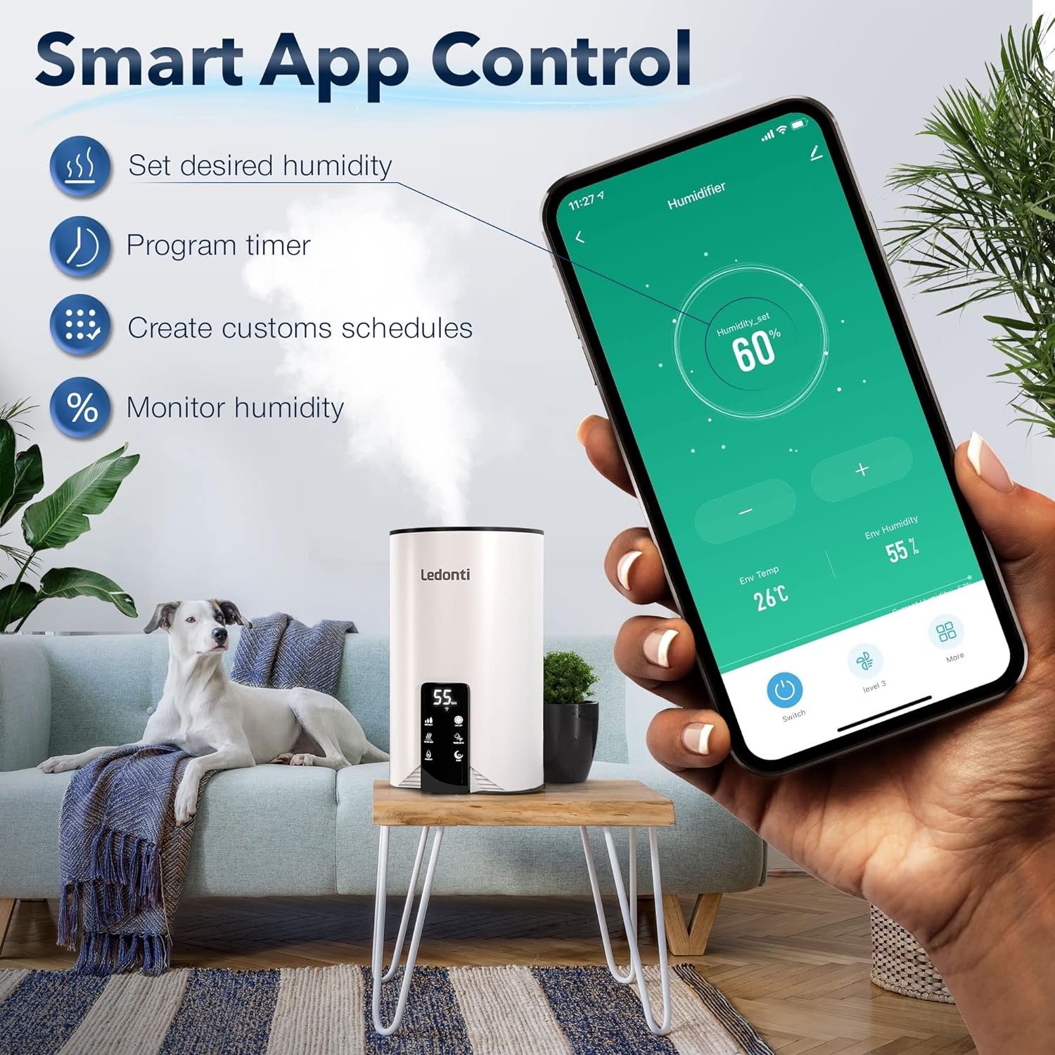 Feature configuration – Turn it on or off, switch between the modes, set the desired humidity level or timer, or just check its performance even when you are not home.