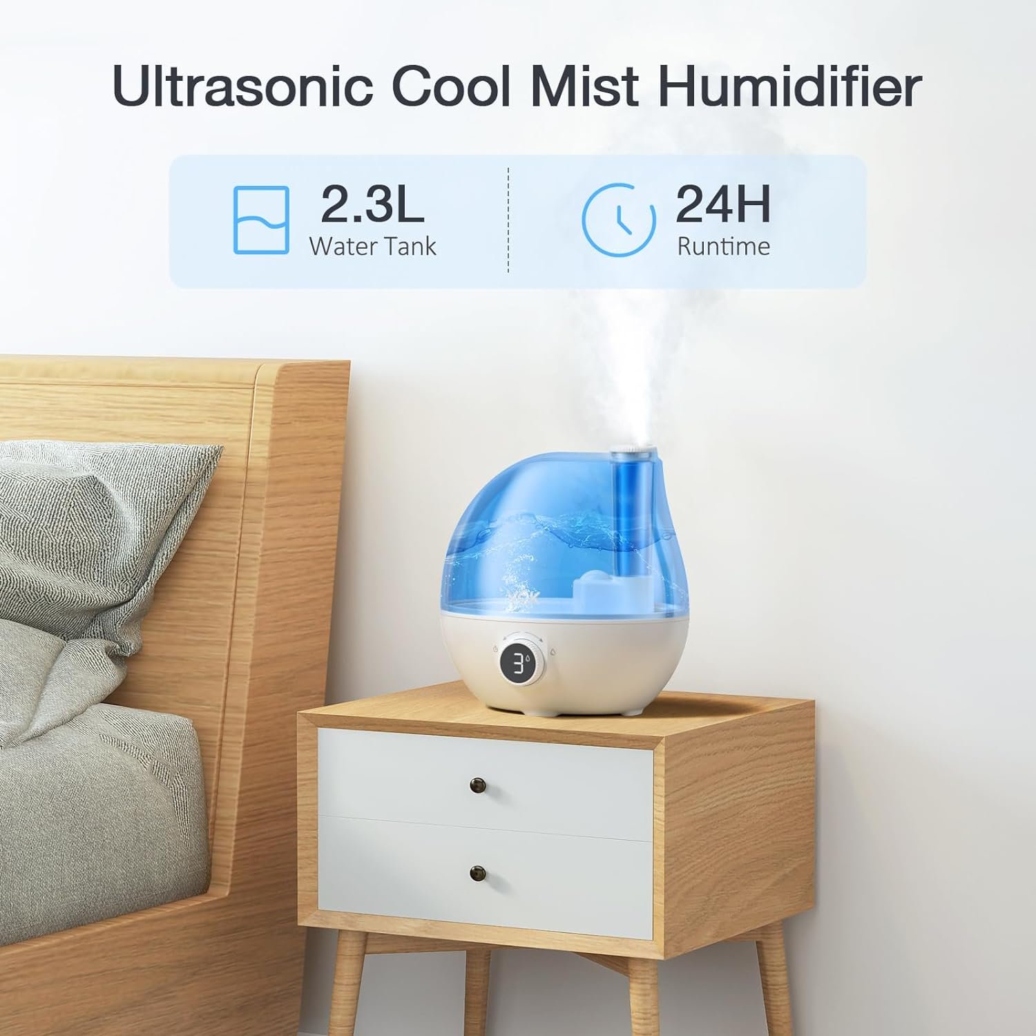 [2.3L Large Water Tank] With its impressive 2.3L super large water tank capacity, this humidifier can continuously provide moisture for over 24 hours on a single fill. You don’t have to worry about frequent refills, allowing you to enjoy consistent humidity throughout the day or night.