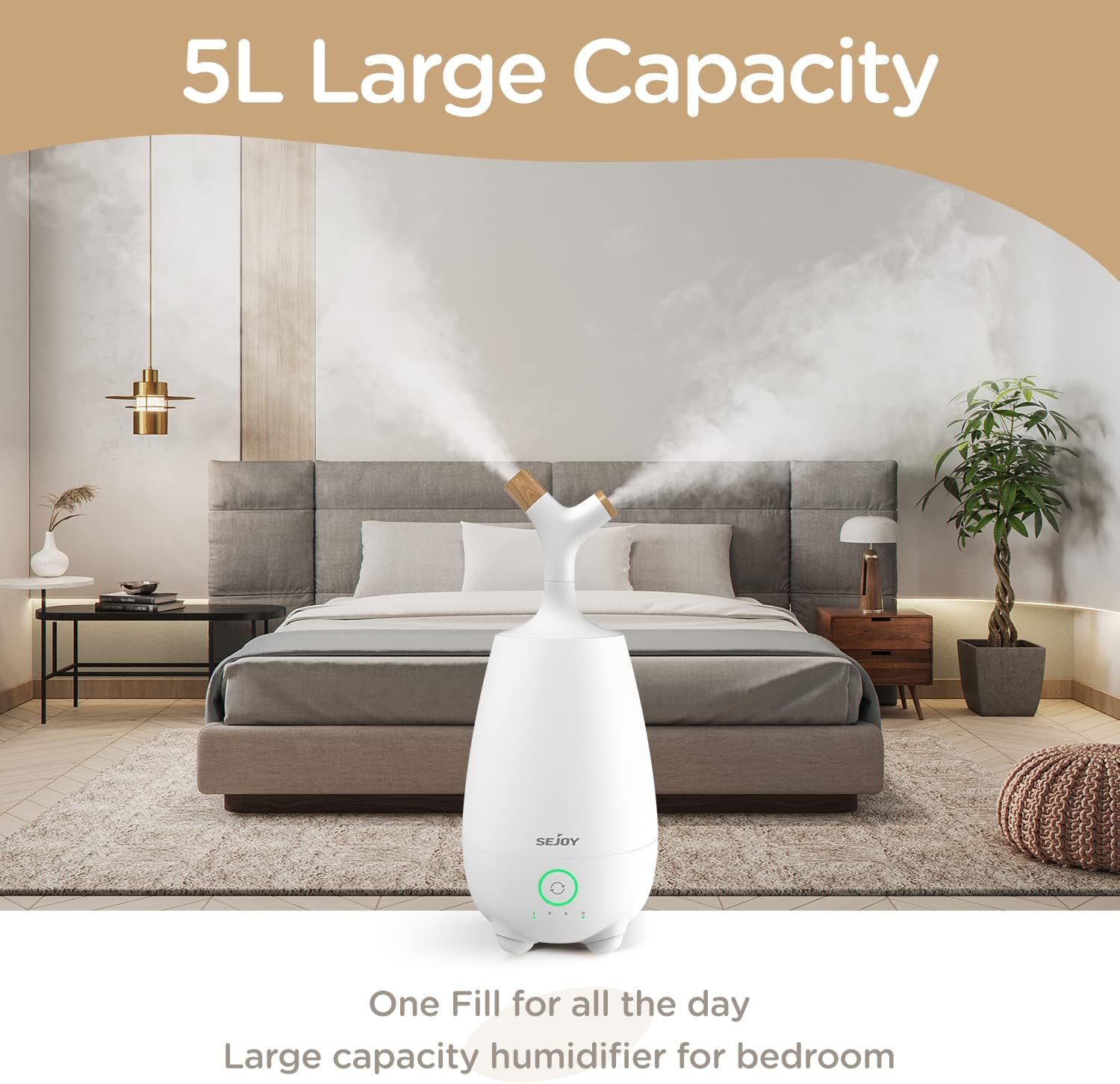 đ§ă5L Large Capacity & Dry ProtectionăSejoy ultrasonic humidifier has 2 adjustable levels of output, cool mist and a maximum output of 350 mL/h. The humidifier for bedroom has a 5 liter (1.32 gallon) tank, lasts up to 24 hours without refill and automatically shuts off when the tank is empty. This humidifier uses durable material and elegant design, making it natural to join into your furniture.