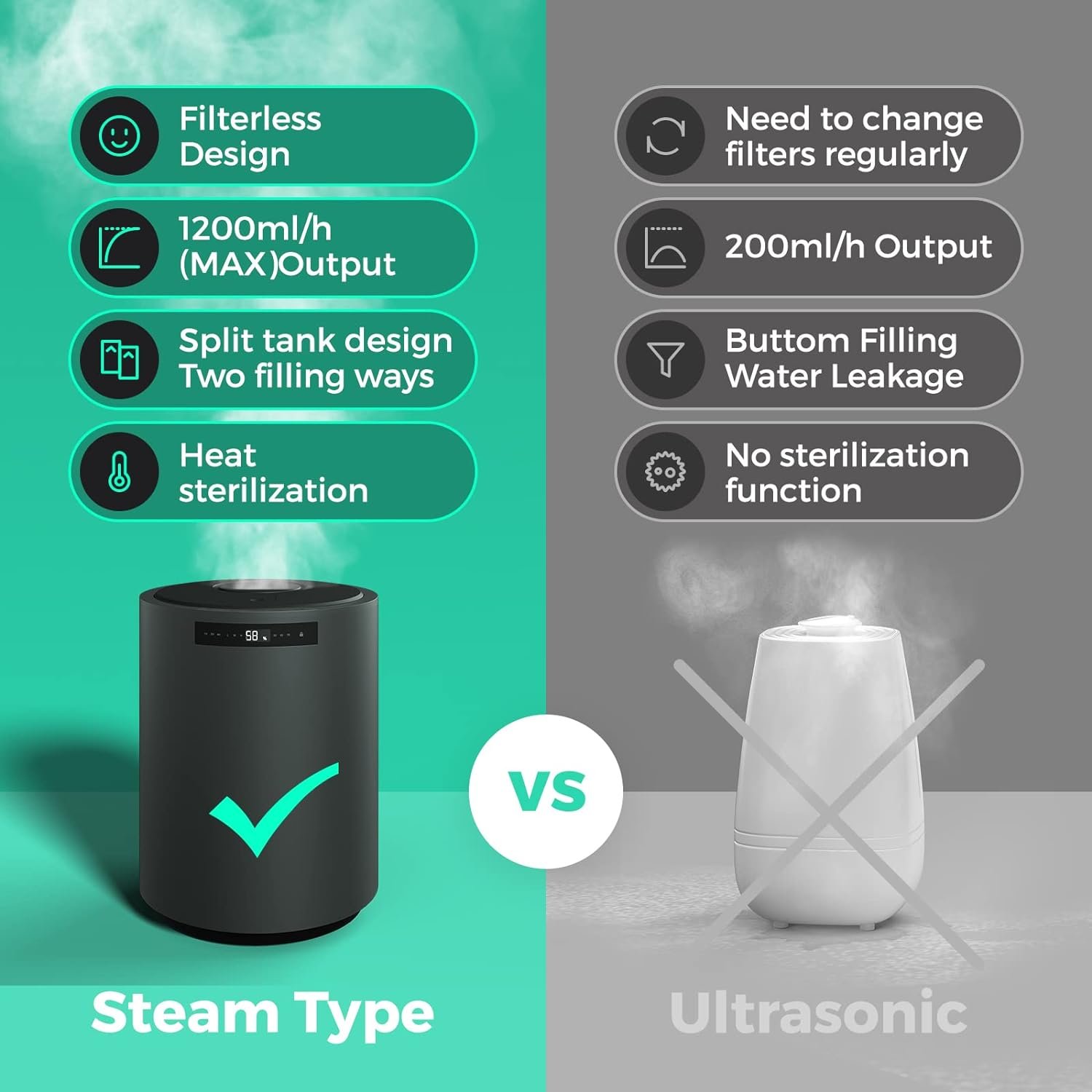Clean and Efficient: Steam humidifier offers more healthy and clean mist by heating evaporation technology. It can enhance the air quality more efficient, keeps your skin moisturized and gives your family a safer humidification way.