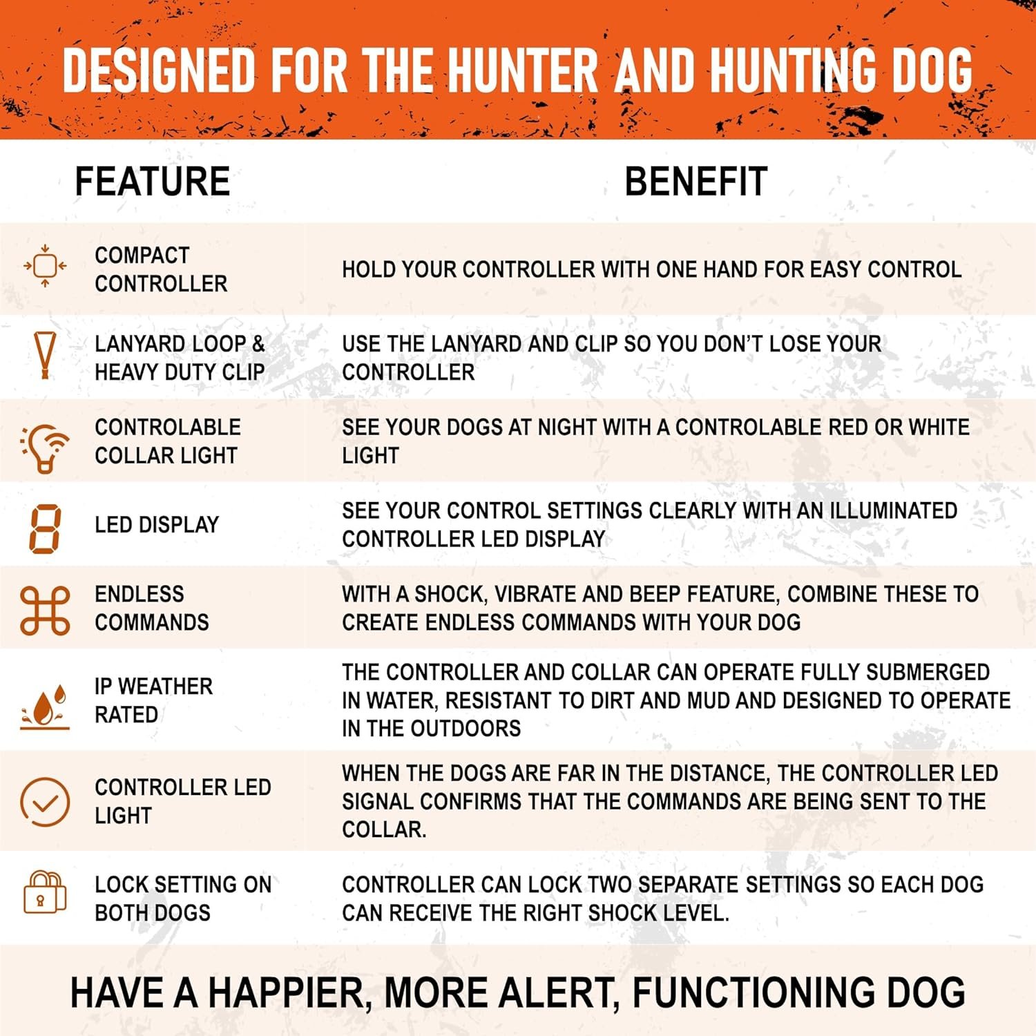 99 levels of static simulation Static and repeated stimulation 8 seconds of safe static shock protection Lock control Vibration modeSound tone beeper Control up to 2 dogs simultaneouslyRechargeable with integrated lithium-ion batteries included LED display presents Rheostat level, Dog channel and battery indicator