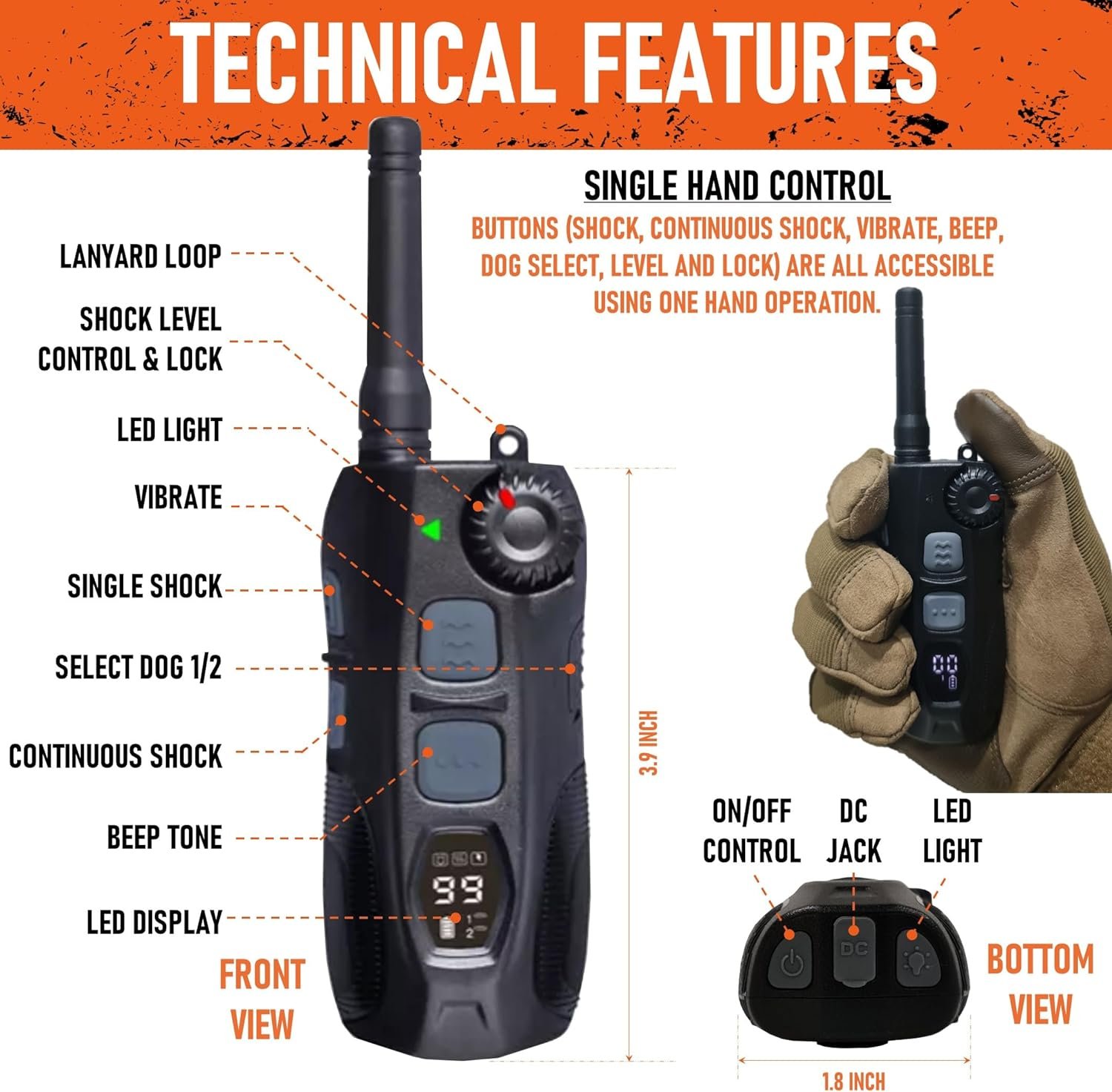 Practical and Rugged: Our training collar for dogs is IPX7 waterproof, and can withstand immersion up to 4 feet for 30 minutes. Each large dog collar is sturdy, with a compact controller, and a built-in LED so you can keep track of your dog at night.