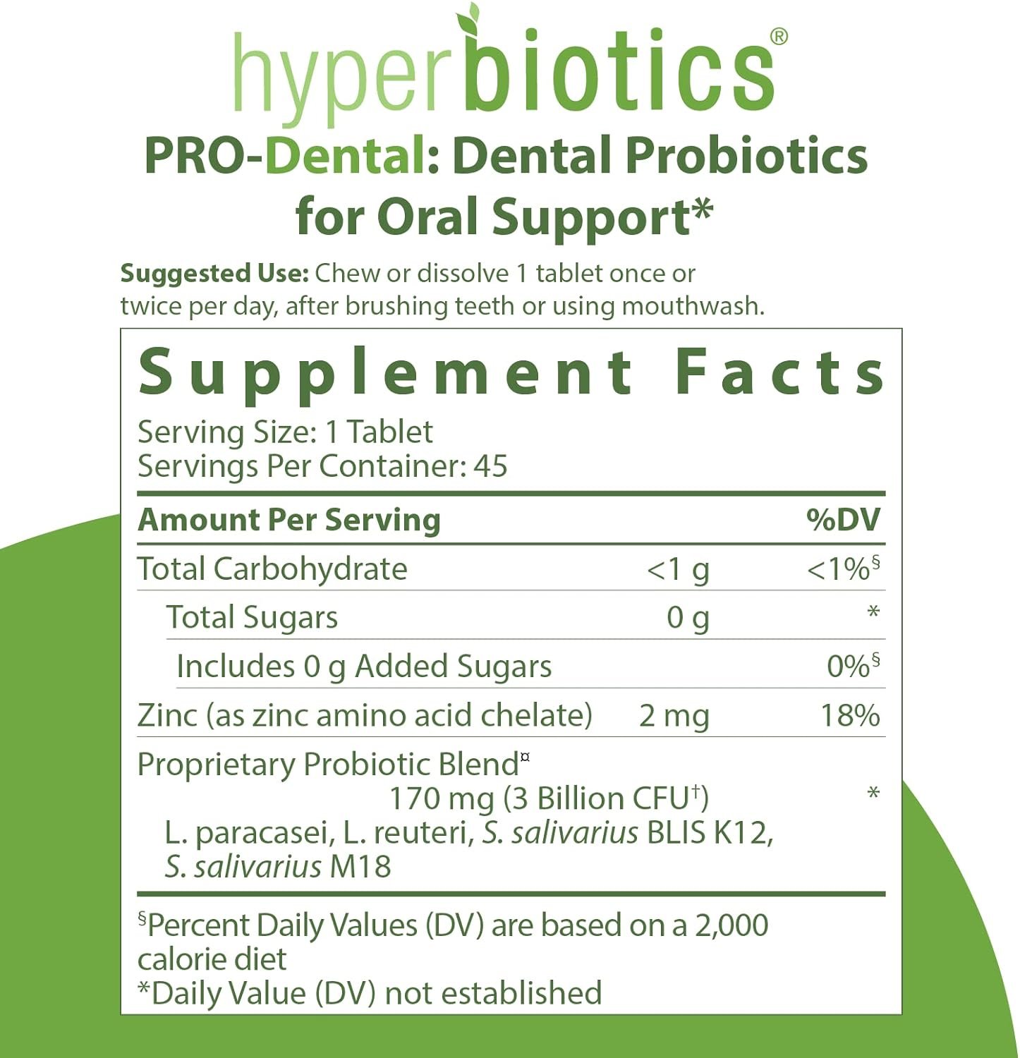 Ears, Nose, and Throat Probiotics For Oral Health: 3 Billion CFU in a chewable tablet with 4 targeted strains. When your oral microbiome is populated with strong probiotic colonies, you are equipped with natural defenses against common invaders. PRO-Dental is formulated with targeted probiotic strains to replenish the balance of good bacteria and may support oral and immune health.*