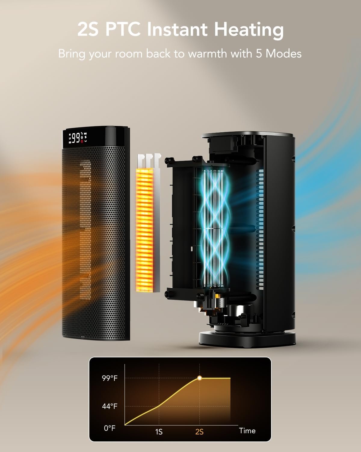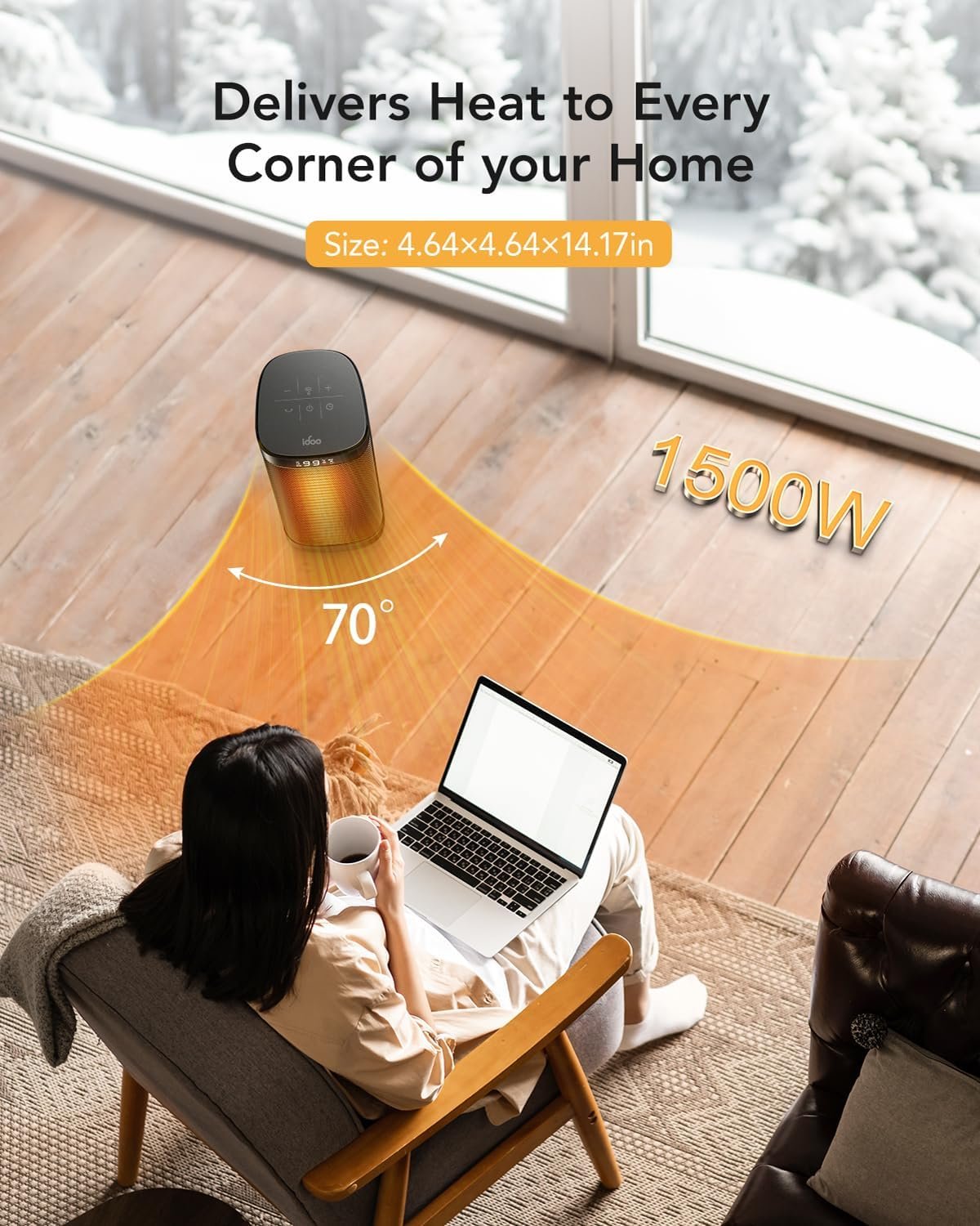 2S Fast heating keeps house warmer. iDOO space heaters combines powerful 1500W PTC system to deliver heat within seconds, together with 70° oscillation which enhance warm air circulation for 200% farther reach than traditional heaters. Heating Coverage:200 sq.ft.
