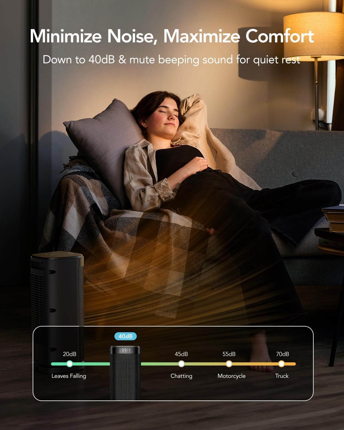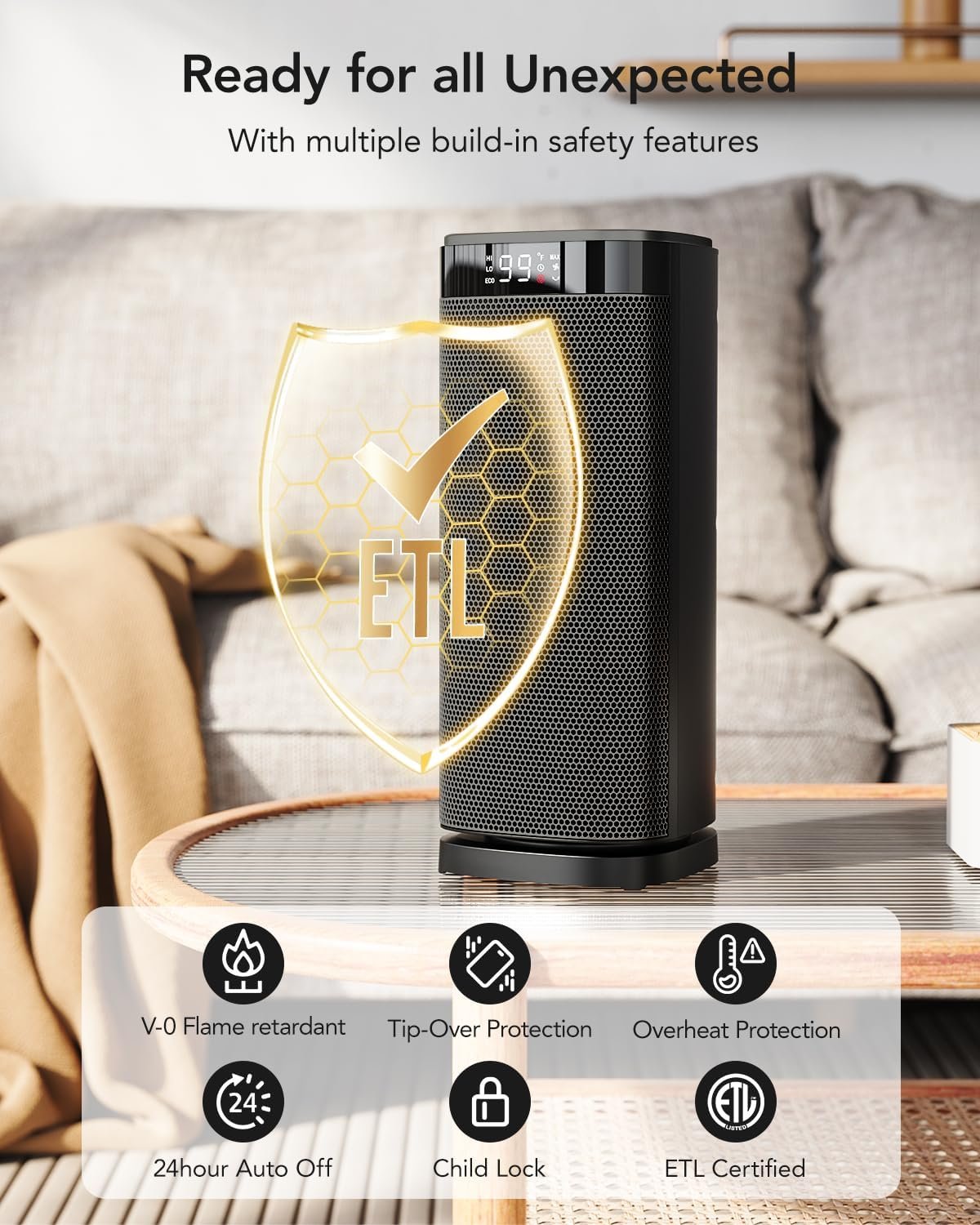 ETL-certified safety,child lock & very quiet. Made of V0 flame-retardant materials with multiple safety features including tip-over protection, overheat protection, child lock, 24-hour timer, 24-hour auto power off. Safe and worry-free all-day use. As quiet as 40 dB, without disturbing sleep or work.