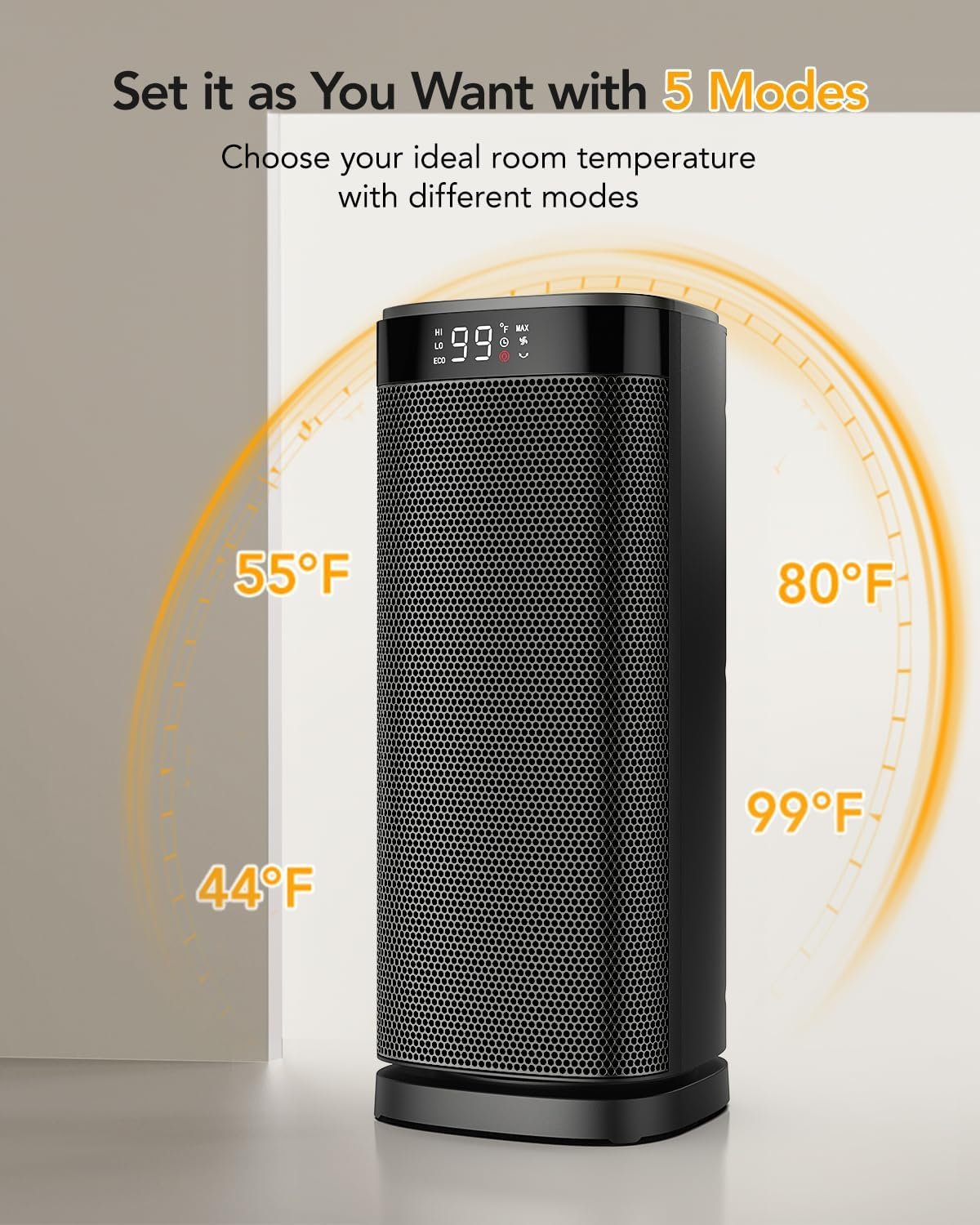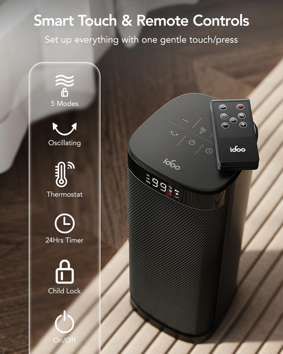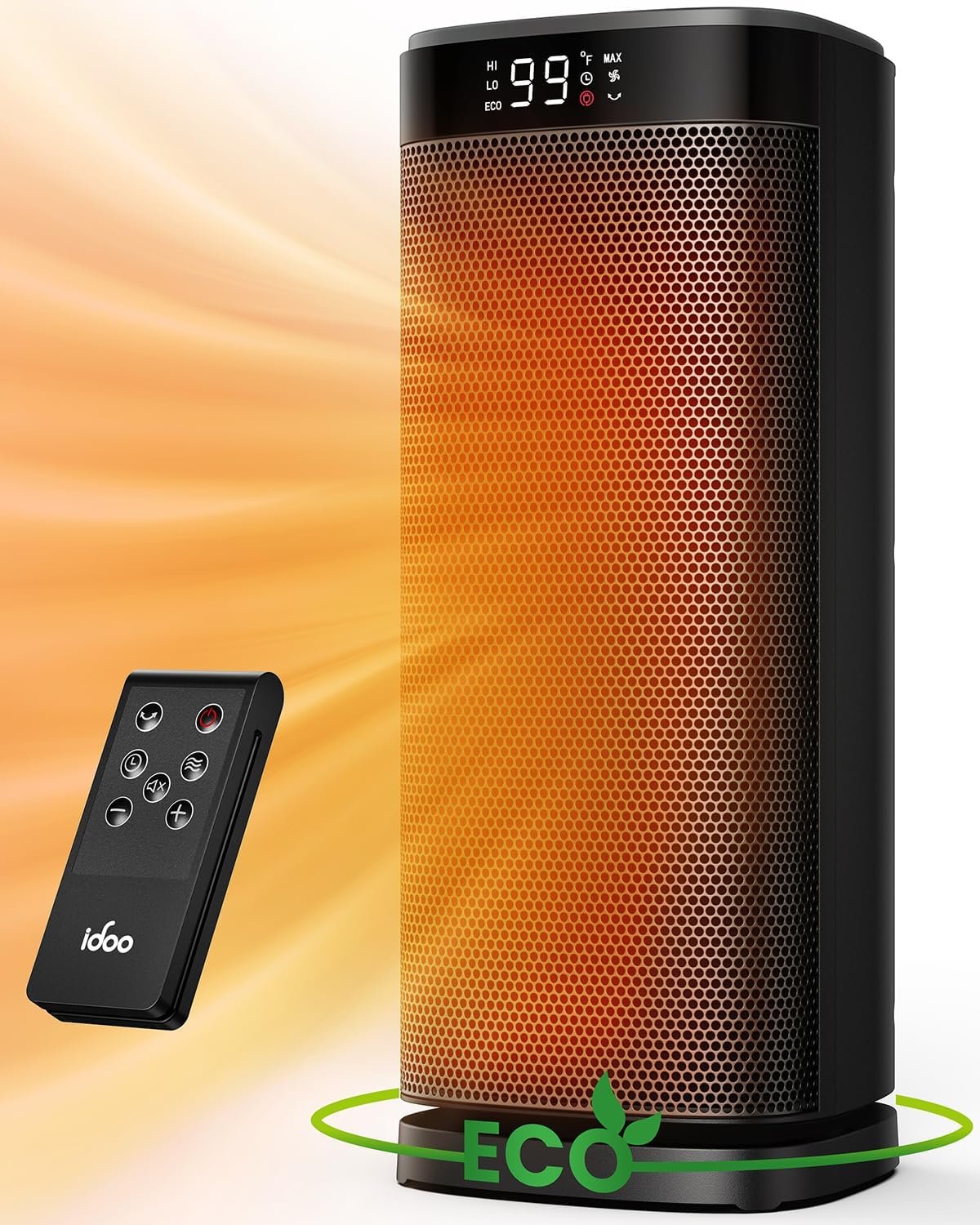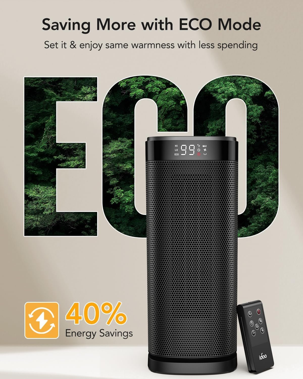 Energy efficient with ECO mode. iDOO electric heater adjusts the heat level automatically to reach your desired temperature while saving more on energy bills. Personalize your own comfort with the digital thermostat from 40 to 99 ℉, adjustable in 1℉ increments, support long press. Memory function also supported.