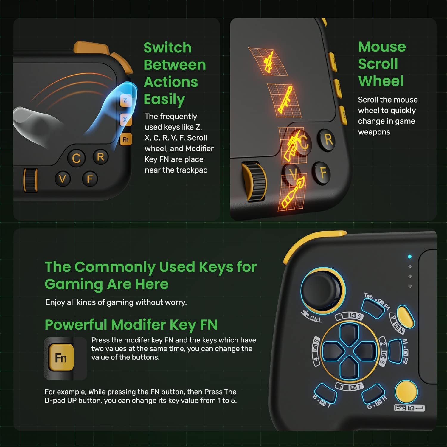 【ERGONOMIC BUTTONS LAYOUT AND EXTENDABLE BUTTONS WITH MODIFIER KEY】Simultaneously move with the right joystick, Targeting with trackpad, fire, jump and do many more, thanks to the carefully placed buttons and trackpad. By using the FN modifier Key, the keymapping of the D-pad and other buttons can be changed to meet the requirement for all kinds of games.