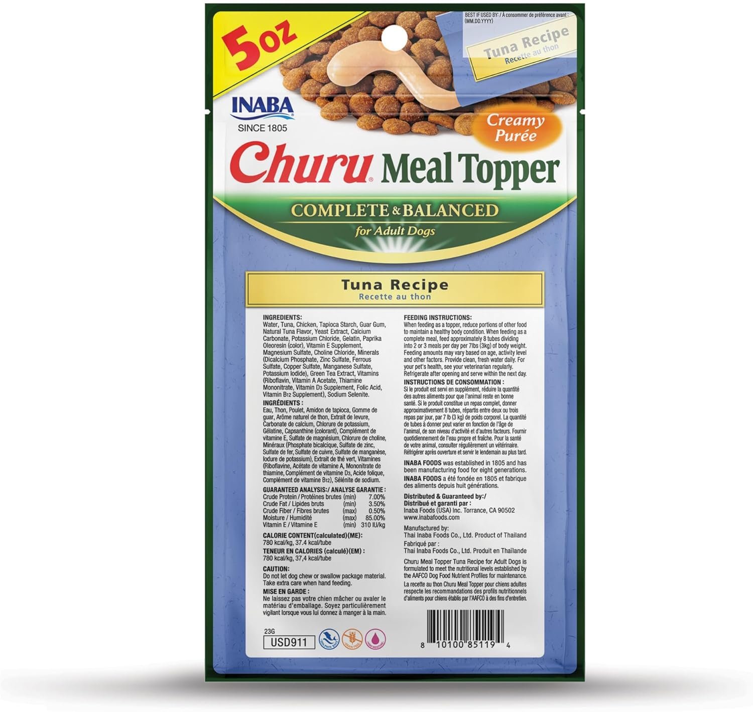 Here at INABA, we know your dog is an beloved family member. That’s why our Churu Meal Toppers for Dogs are made from high-quality ingredients, including wild-caught tuna and/or farm-raised chicken. These are a brand-new, completely balanced Churu for your dog to crave. We’ve taken the same creamy purée texture they love and packed it with vitamins, like Vitamin E and B12, and minerals, like Calcium, making it something that you can feed as a food or add as a topper. And we’ve kept it grain-free, preservative-free, carrageenan-free and free from artificial colors. then we’ve wrapped it up in a single-serve 1.69 ounce tube, which means you can still hand feed it to your pooch, if that’s how they prefer to consume Churu. Add a squeeze to their kibble bowl and you’re helping add additional hydration (85% moisture) and only adding about 37 calories per serving. Perfect as a snack to pack with you on walks to the park or hiking the trails. Churu Meal Toppers can also be used to hid or disguise medications. Available in two sizes and seven different flavors- perfect for dogs of all ages. INABA Churu Meal Toppers for Dogs make meal time or snack time fun for you and your dogs.